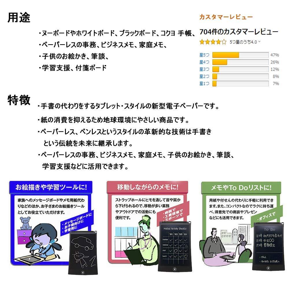 本製品は手書を代わりするタブレット・スタイル新型電子ペーパーです。付属したのペンで液晶画面に直接書き込みができます。eraseボタンを押すと、瞬間に画面をリセットでします。筆圧に合わせて太い線も細い線もなめらかに書くことが可能です。そして、指、ボールペン、鉛筆、ペンなどは電子メモパッドに書くことが可能です。