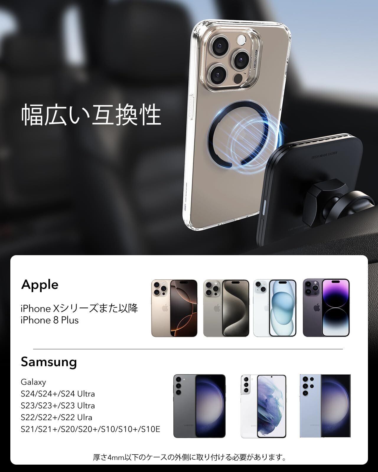 【対応機種】iPhone 16e/16/15/14/13/12シリーズ、Samsung Galaxy S23/S22/S21などに対応しています。対応している機種の詳細なリストについては、商品の説明の所をご覧ください。このリングは一度貼ると、取り外すことはできますが、貼り直すことはできません。