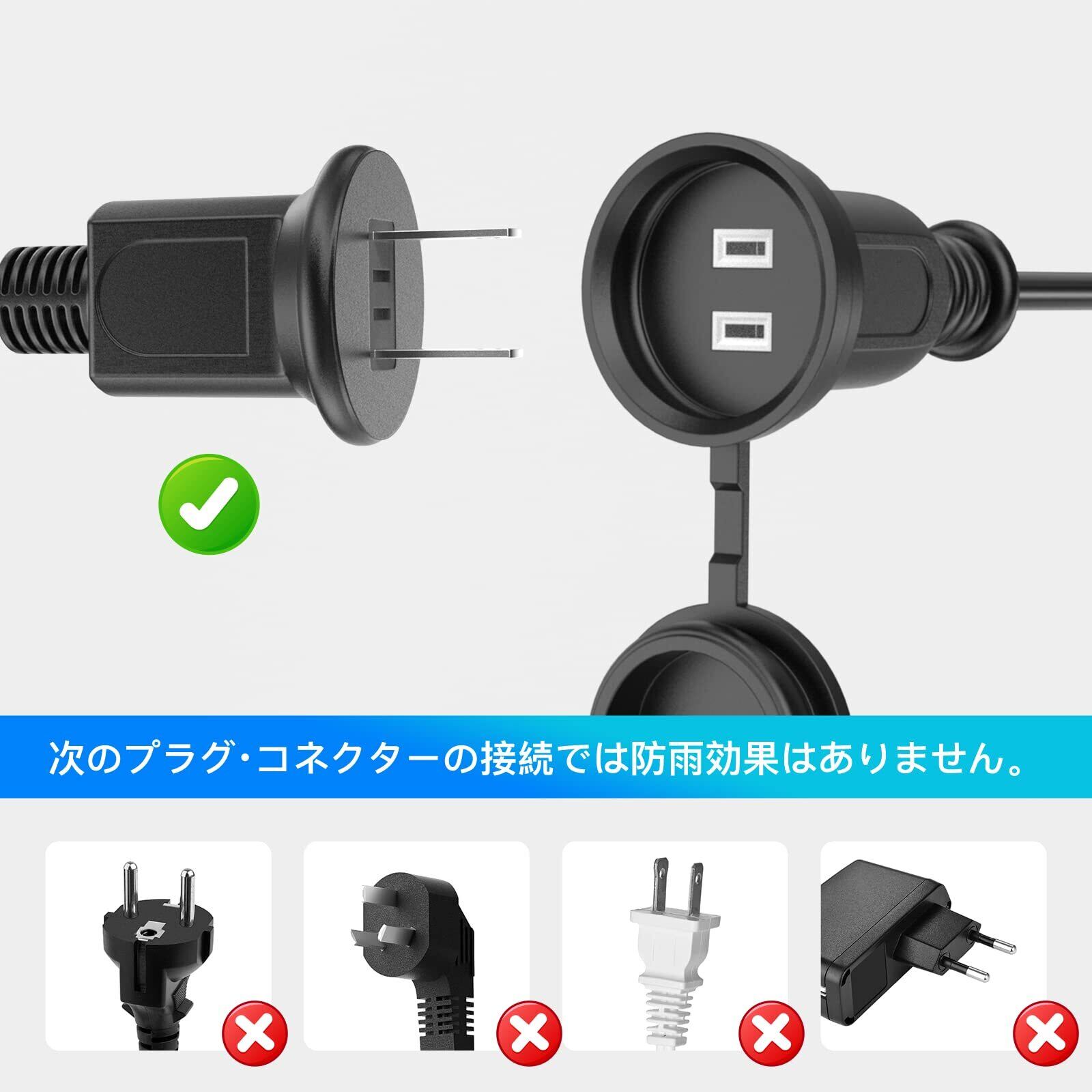 【注意事項】 ※このコードは合計1500W以下で使用して下さい。 ※この製品を濡れた手でのプラグなどの抜き差しは決してしないで下さい。 ※プラグはきっちりと差し込んでお使いください。接触不良で発熱する原因となります。 ※コードは束ねて使用したり、上から物を載せないで下さい。焼損の恐れがあり、火災の原因になります。 ※「防雨機能」が有効となるのは、ご使用される機器側も「*防雨対応の電源プラグ」である場合に限ります。 ※本品は『防雨仕様』であり、完全防水製品ではございませんので、大量の水が掛かる場所や水中ではご使用しないでください。