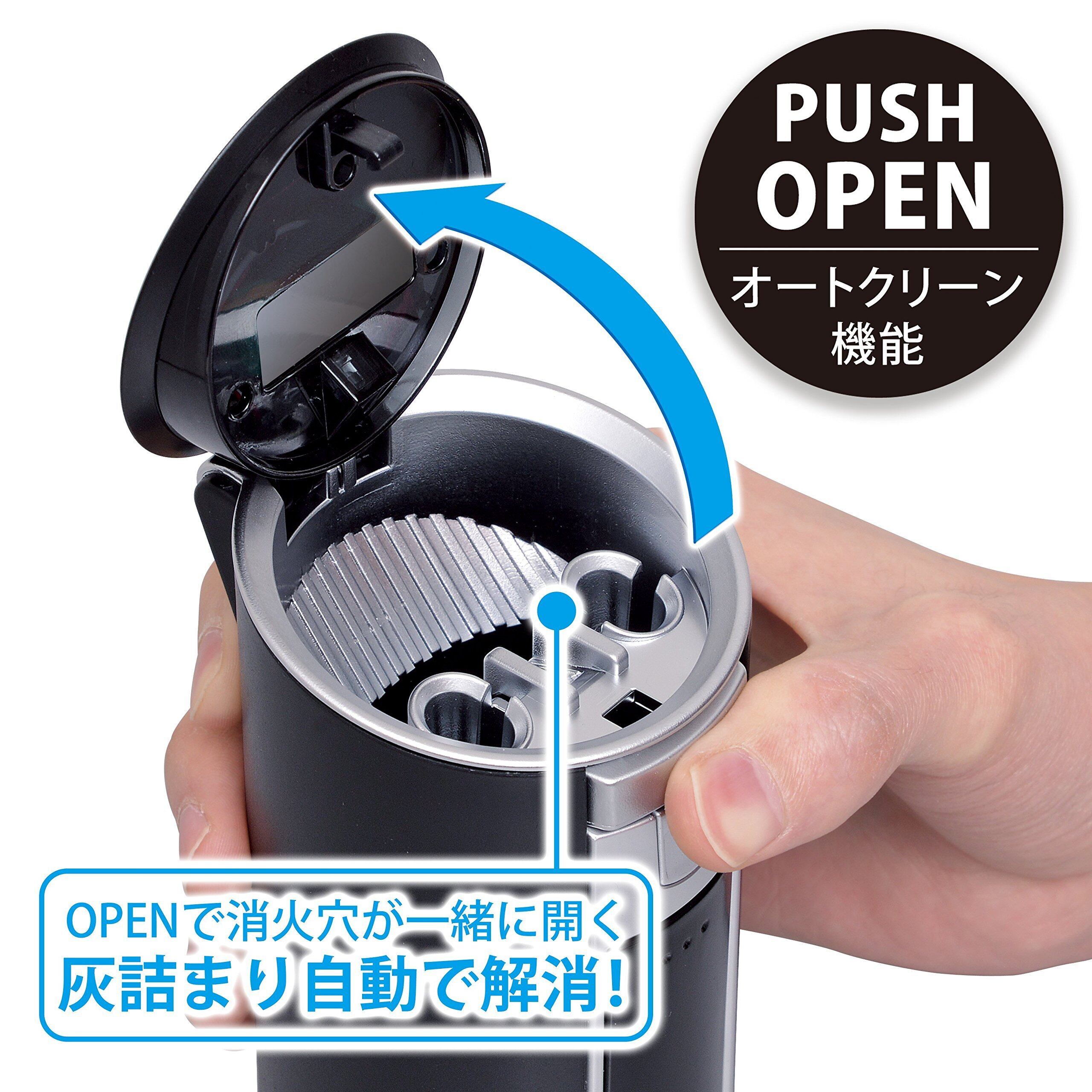 ワンプッシュで溜まった吸殻をカンタンに捨てられる機能が付いた灰皿です! ! フタもワンプッシュでオープンできます。フタを開ける度に、消火穴に詰まった灰を自動で落とすことができます。周囲が暗くなると、自動でLED照明が点灯します。(フタが開いている時。)タバコ置き、消火穴ともにスリムタバコに対応しています。