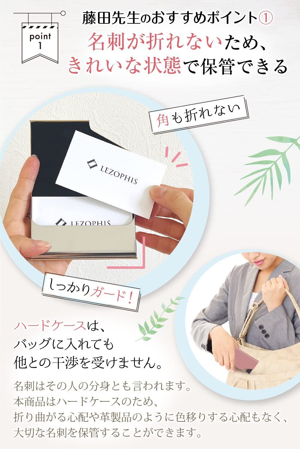 おすすめポイント① 名刺が折れないため、きれいな状態で保管できる。ハードケースはバッグに入れても他のものの干渉を受けません。