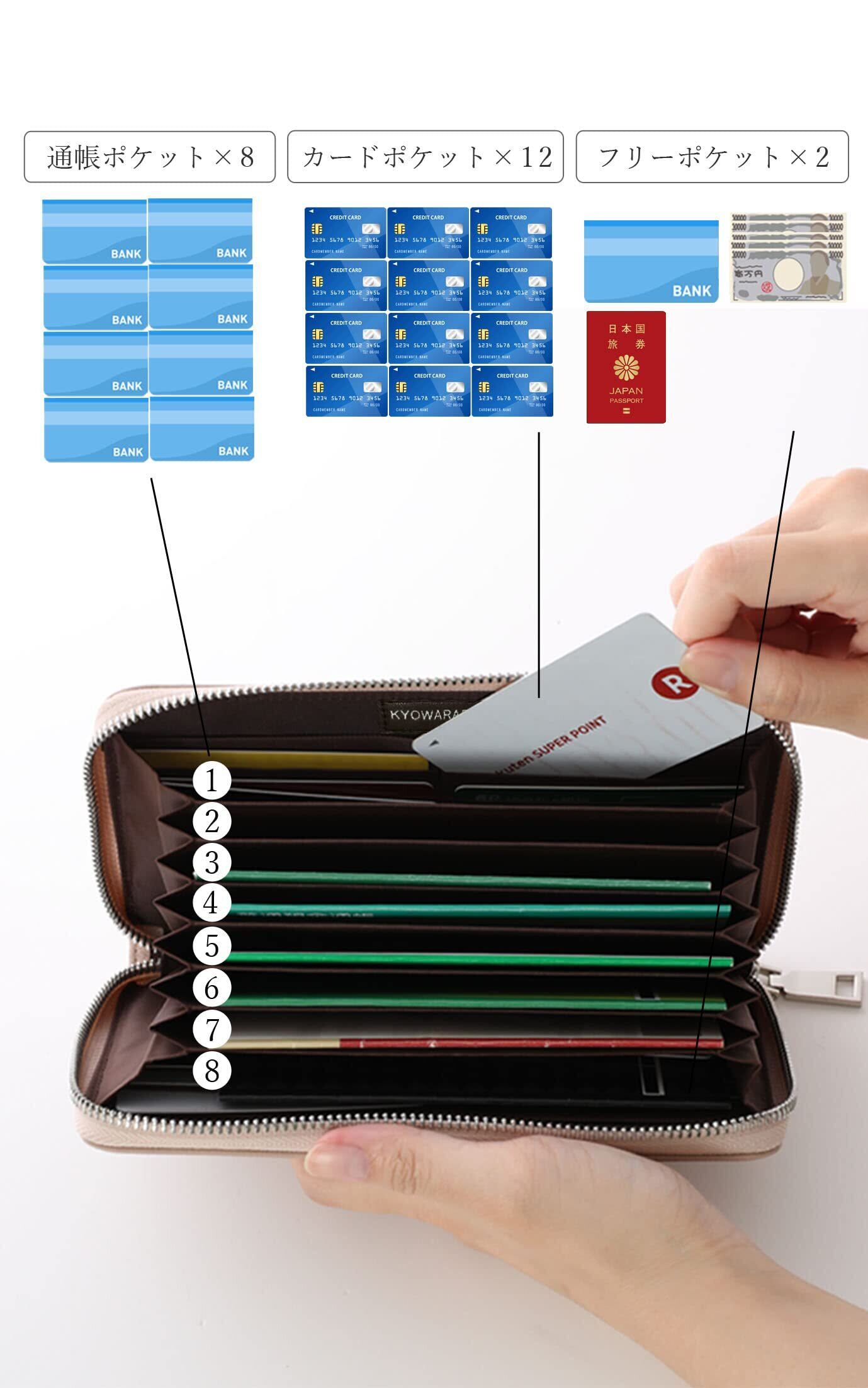 【見た目以上の収納力】通帳ポケットが8枚、カードポケットが12枚、お札などを入れるポケットが2つとこのサイズでこの収納力はクラス最高です。