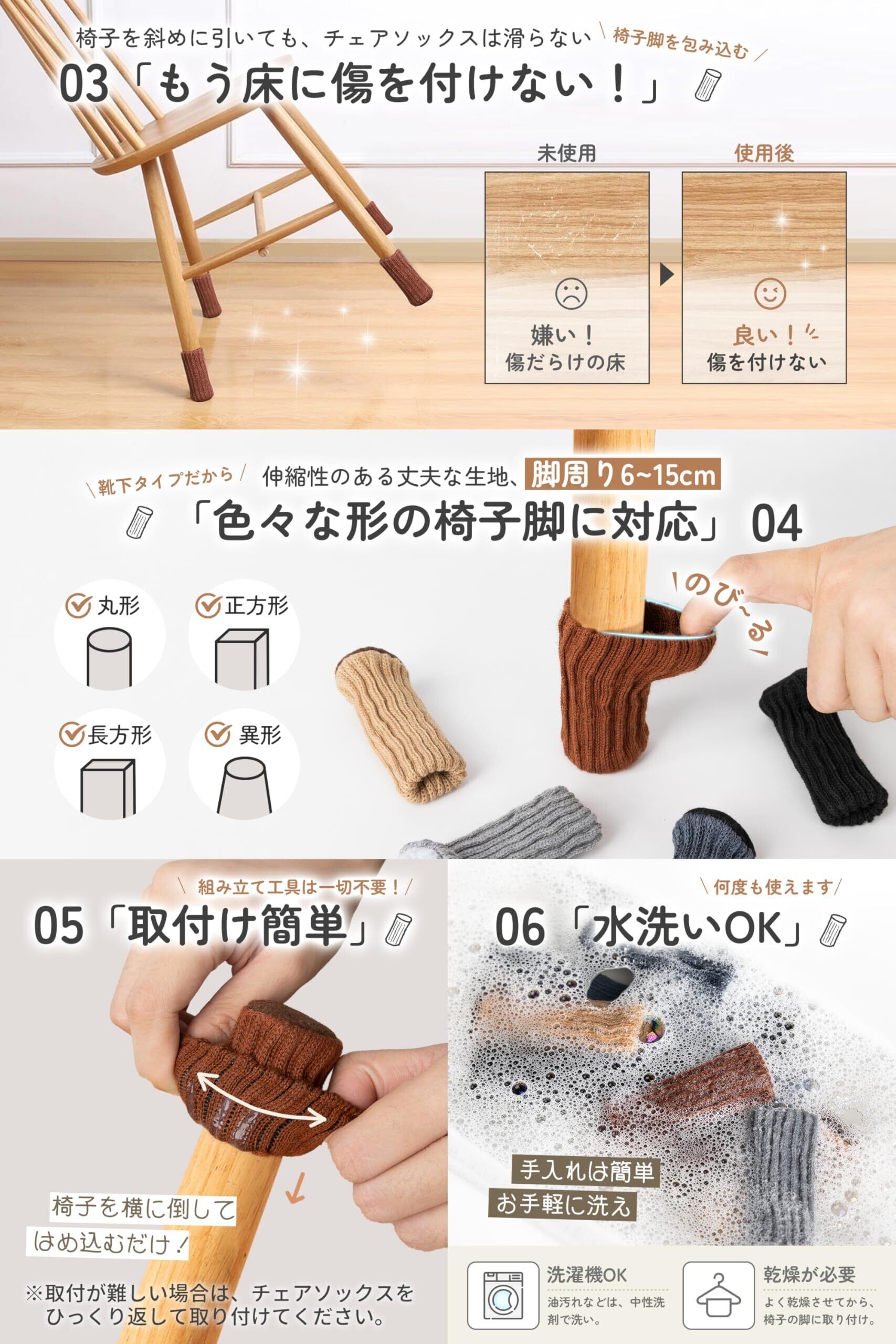 【二重構造&厚底フェルト・高耐久性】 ボディ部分には二重ニットを採用し、底部には厚いフェルトを使用しています。これにより、椅子脚カバーは磨耗に強く、防音効果も抜群です。椅子脚を保護しながら、床の傷も防止します。また、滑りやすい素材により、椅子をスムーズに動かせ、動かす際の騒音も抑えられます