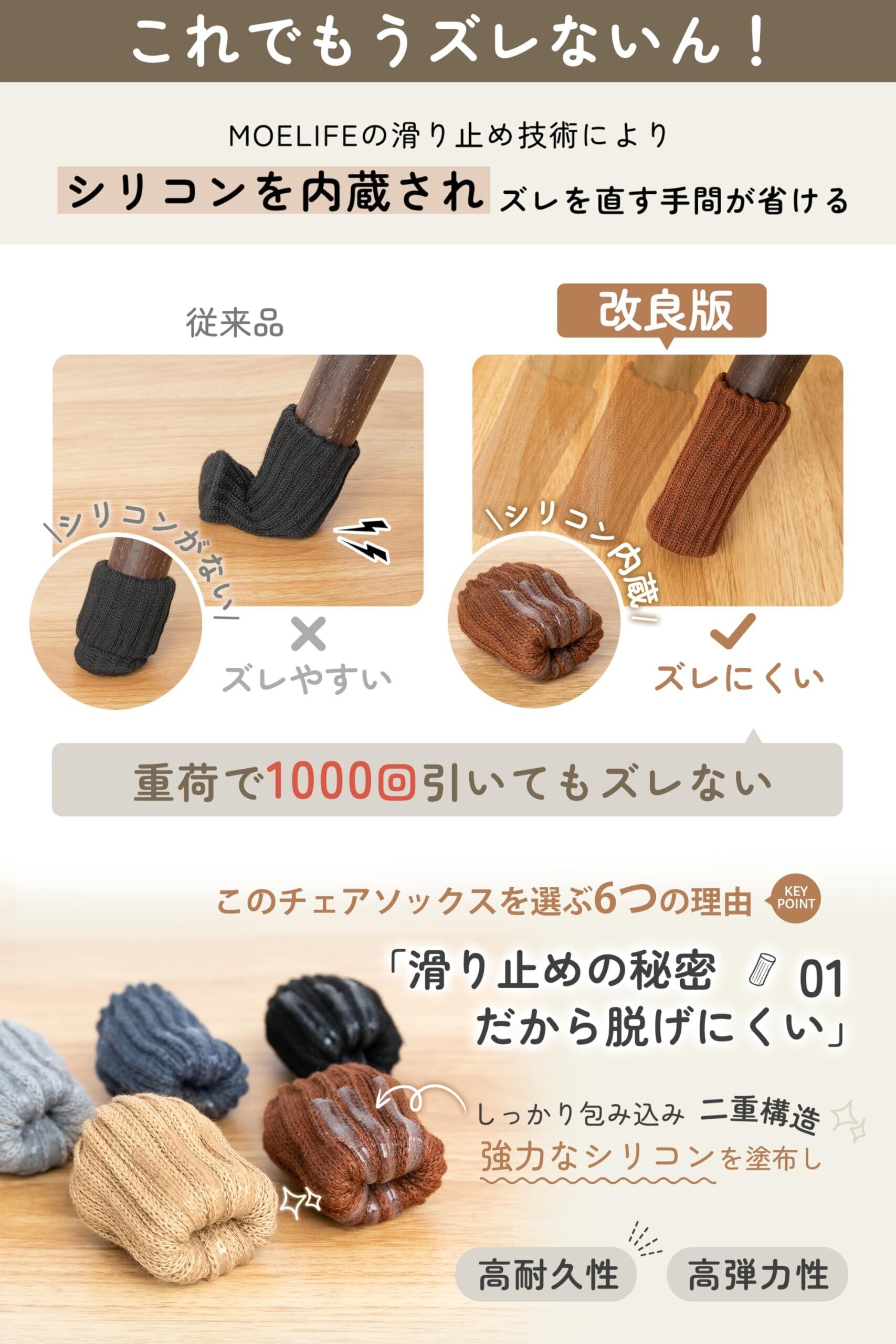 【滑り止めシリコン・脱げにくい】 チェアソックスの内側には滑り止めシリコンを塗布しています。従来品と比べて、脱げにくさが飛躍的に改善されています。装着後は、ソックスが椅子脚にしっかりとフィットし、一度装着すればズレを直す手間が省けます