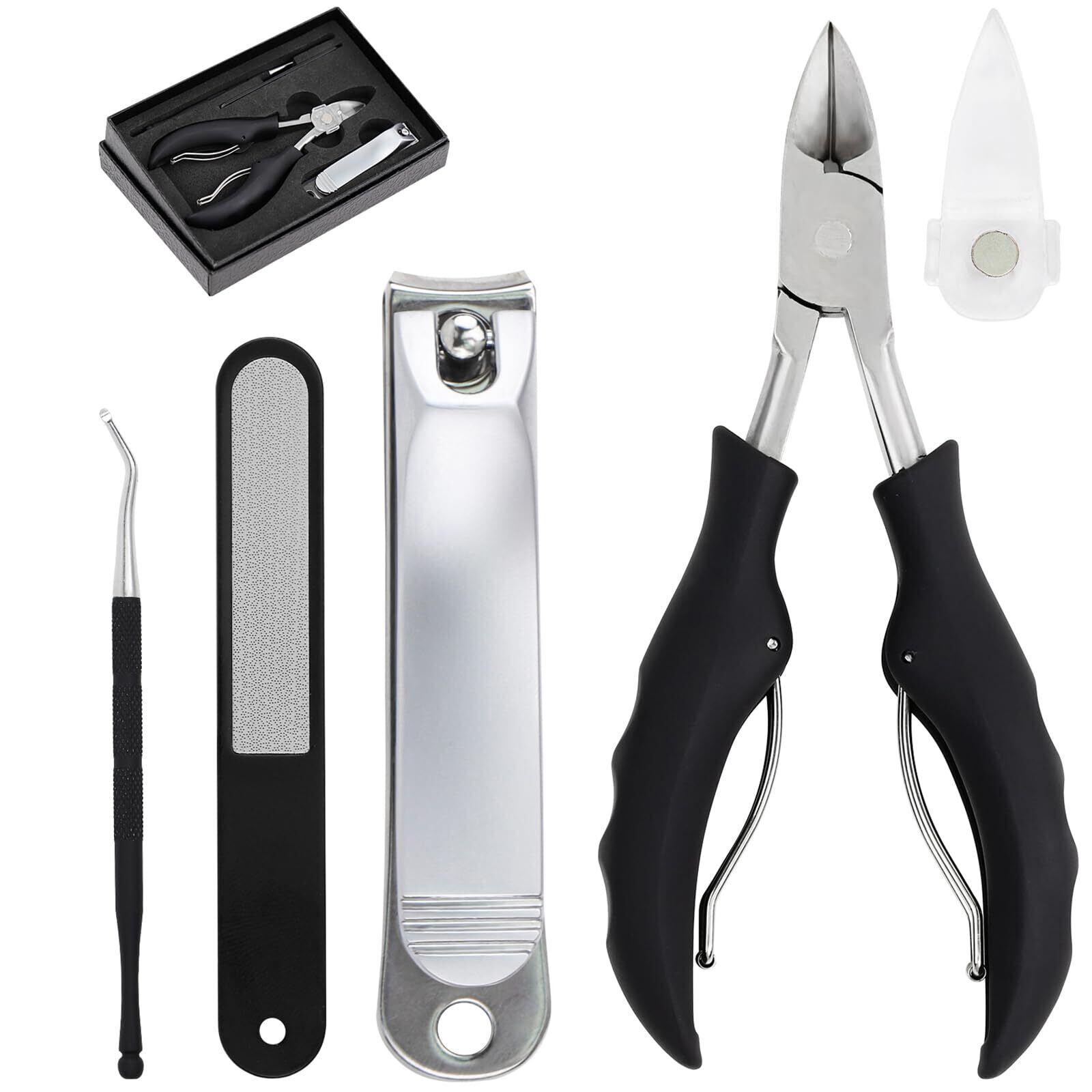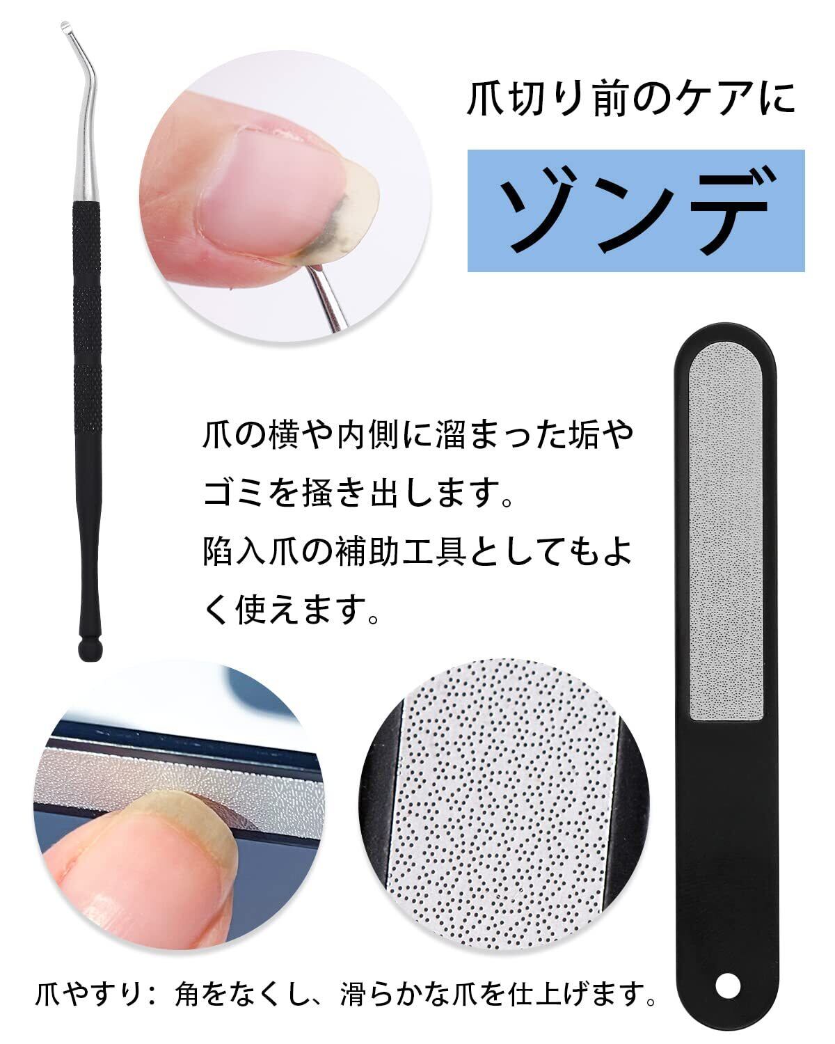 【爪切り セット】巻き爪、厚い爪、硬い爪などのケアに適した高品質爪切りセットです。セットには刃先の形が異なる二種類の爪切り ニッパー、爪切り、爪ヤスリ、甘皮リッパーと爪垢取り両用ゾンデが含まれ、自宅で爪のセルフケアができます。