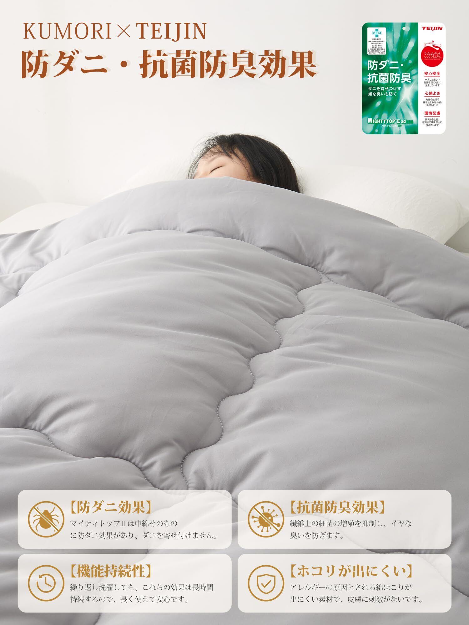 【防ダニ・抗菌防臭】中綿には防ダニ・抗菌・防臭効果のある帝人「マイティトップII」を50%使用しています。長く肌に触れる布団をいつも清潔にご使用できます。