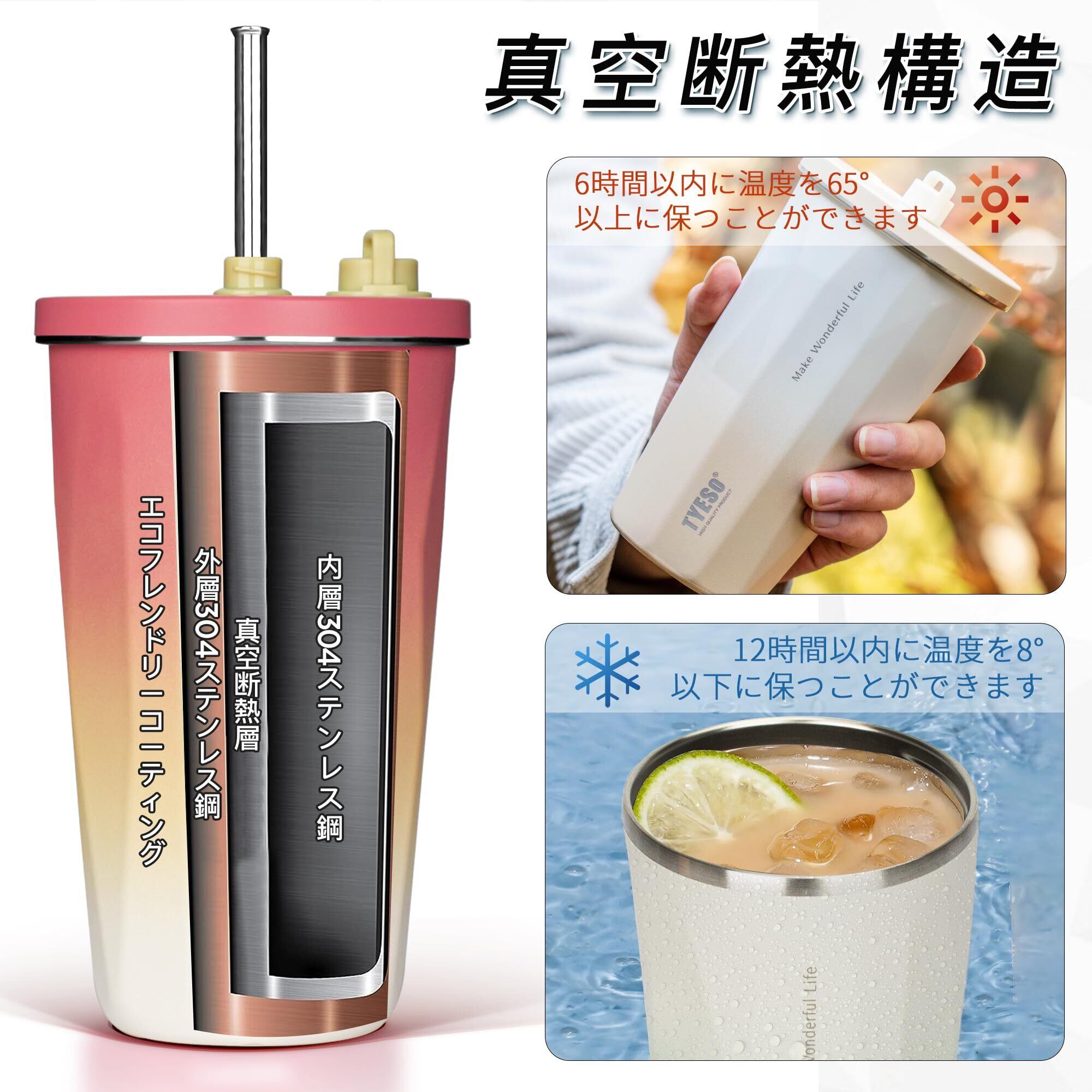 タンブラー ストロー付き ステンレス 広口 真空断熱 ホームオフィス アウトドア 多色 保温 保冷 ふた付き 600ml 大容量 女の子 男の子
