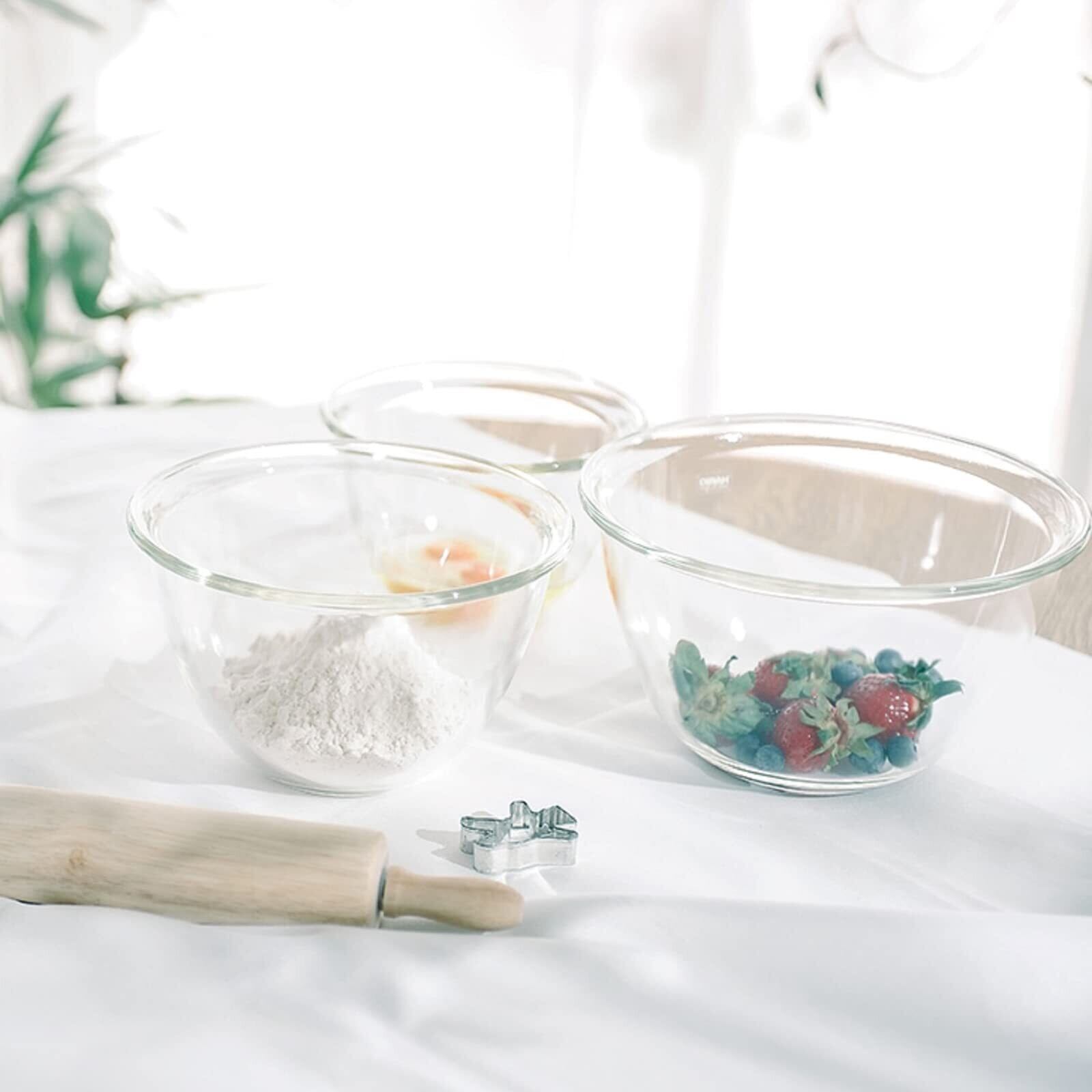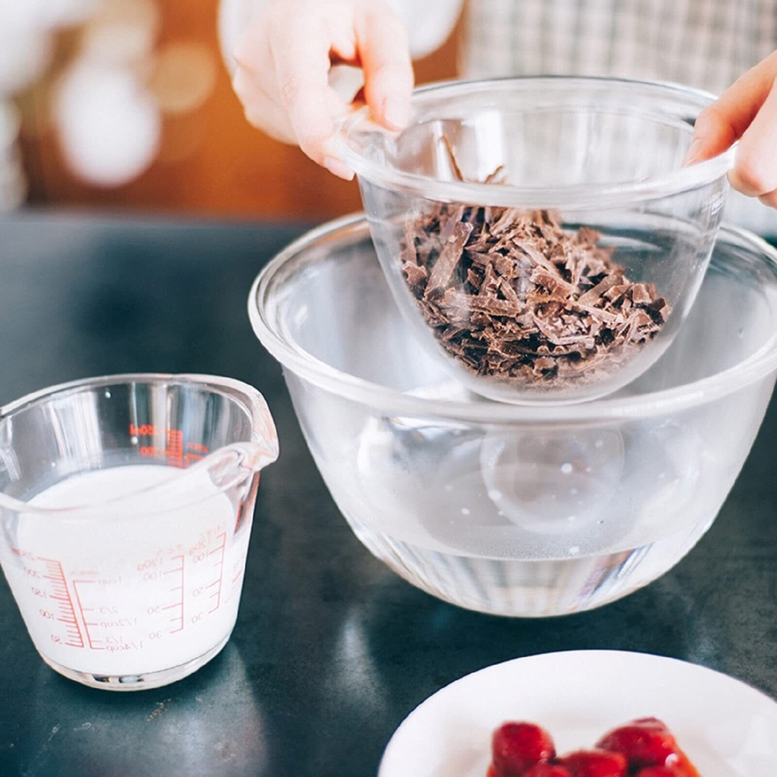 熱湯、電子レンジOKの耐熱ガラス製ボウル。深さがあり、ハンドミキサーでも使いやすい形状