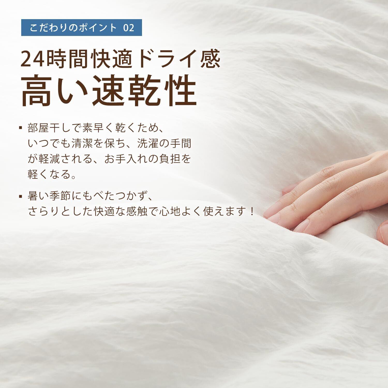 <洗いざらし&速乾性>:洗い加工により初めから自然な風合いと柔らかな肌触りを実現し、使用ごとにさらに柔らかくなる。通気性が高く、速乾性にも優れており、清潔さを保ちやすい。