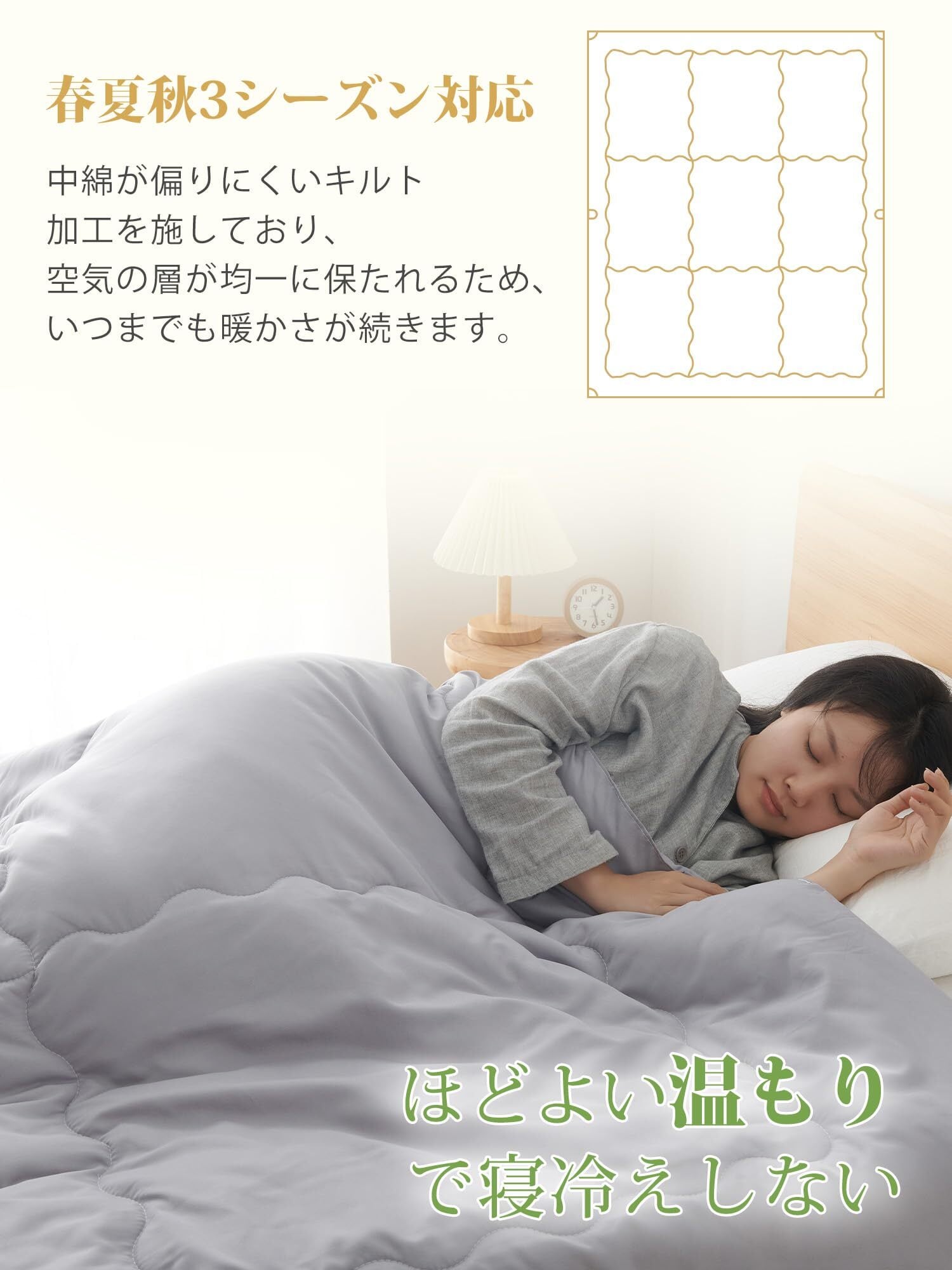 【軽くてふわふわ】わた量を通常の掛け布団の半分ほどにすることで、ふわっと軽くて体への負担を感じさせないです。適度に保温性があり、春から初秋にぴったりのアイテムです。