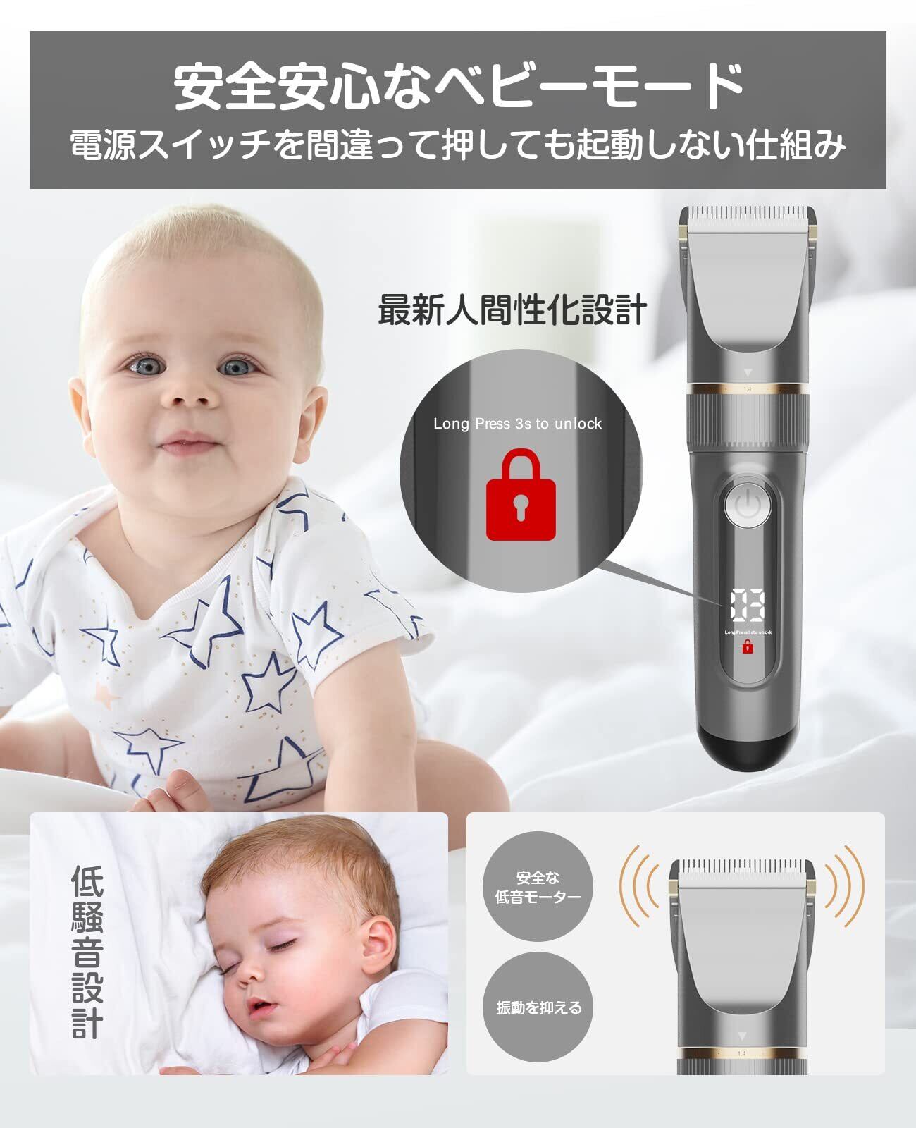 【安全安心なベビーモード&低騒音】電源スイッチを三秒以上長押すと安全ロック標識が五回点滅してベビーモードに入り、スイッチを間違って押しても起動しない仕組みです。バッグに入れる時も、子供がある場所にも安心できます。最新の振動を軽減する低騒音技術を採用し、部屋で普通の話し音との程度なので、騒音を気にせず近所に迷惑をかけません。子供やお子様が驚くことはなく、赤ちゃんが寝ている間に髪を切っても起こす心配もありません。幼児からお年寄りまで誰でも安心で簡単にカット!