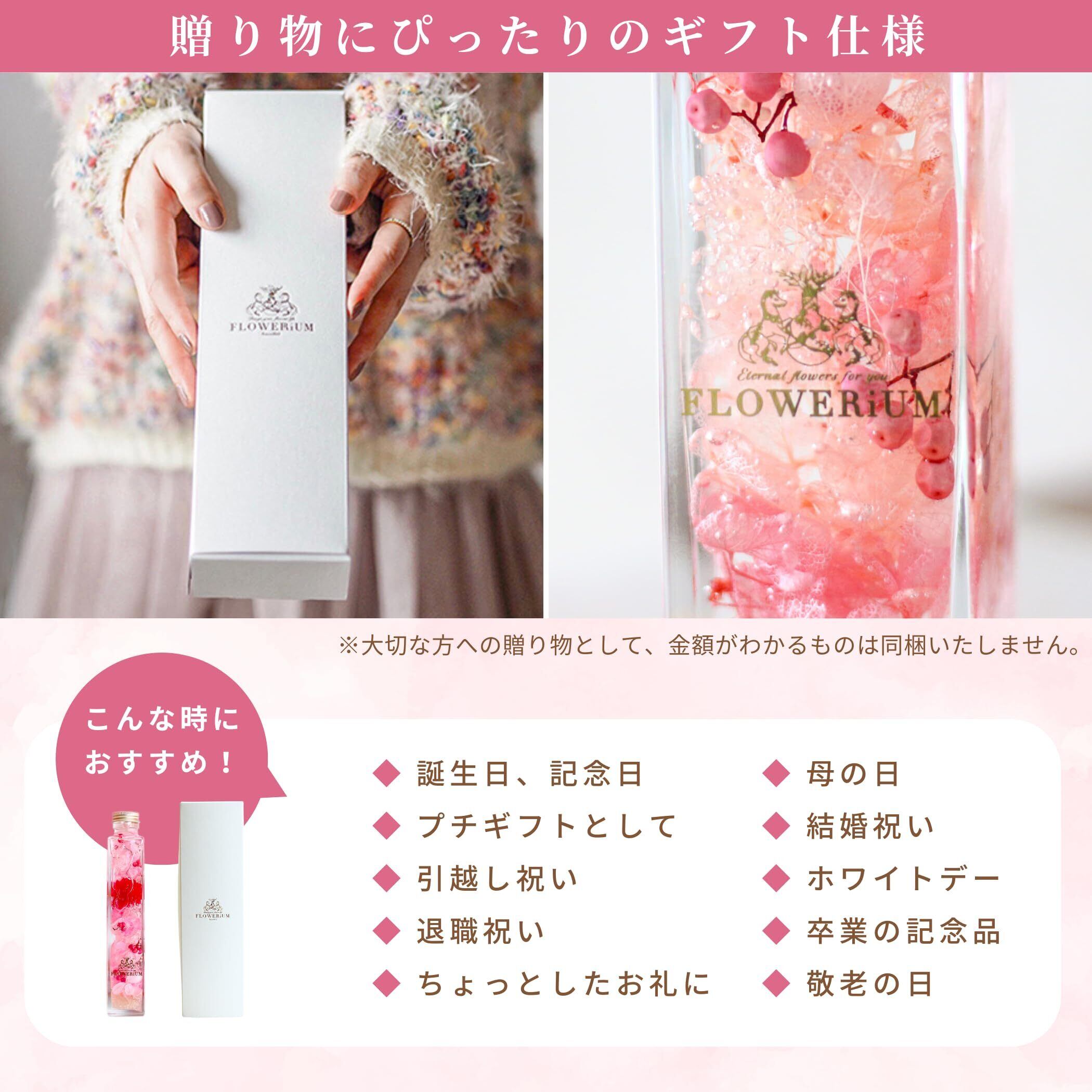 【FLOWERiUM︎はラッピングにもこだわりを】オリジナルギフトBOXに入れて大切にお届けいたします。母の日に日頃の感謝を込めて贈ると世界にたったひとつの特別なプレゼントに。大切な人への贈り物におすすめです。 ※一点ずつ手作りであり、自然のものを使用しているため色合いや形には個体差があります。 実物に近いお色のお写真を使用しておりますがご使用の液晶画面により実物の色と異なって見える場合がございます。ガラス瓶に入っておりますので、落下などで破損しないように取り扱いにはご注意ください。※ギフトとしてご利用のお客様へ。贈り主の表示に必要なため必ず『ギフトの設定』にチェックを入れてください。贈り主様のお名前を受取人様がご確認いただくために必要となります。