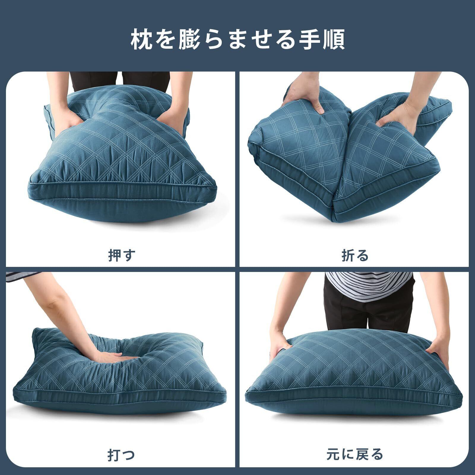 【高反発素材-復元力を持ち】厳選した高弾力の3Dポリエステル素材をボリュームたっぷりに詰め込み、ふっくらとした弾力を持つ同時にふんわり包み込まれる寝心地を実現します。適当な弾力で、頭部をしっかりサポートし、横向き寝・仰向け寝・うつ伏せ寝、お好きな寝姿でぐっすり眠れます。