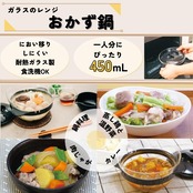 【商品詳細】 本体サイズ:幅19.5×奥行16.3×高9.5cm、本体重量:約280g、実用容量:450mL、本体材質:本体/耐熱ガラス、フタ・取手/ポリプロピレン、日本製