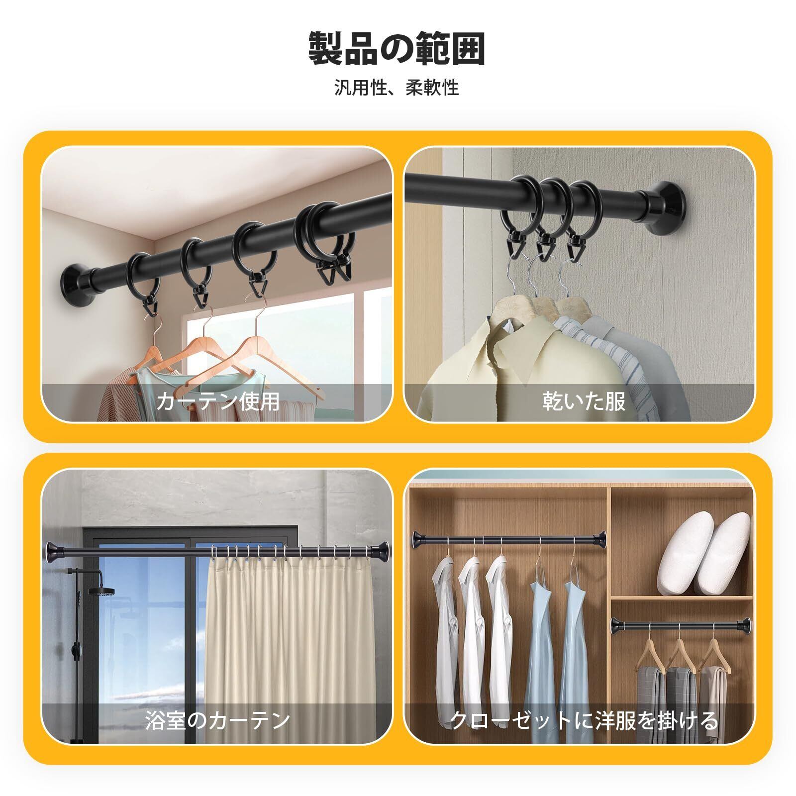 ◆【製品設計上の理由】潮風による腐食を防ぐため、ステンレス鋼の表面にはコーティング加工を施しています。塗装工程でステンレス鋼管の色を変えながら、製品の防水性能と防錆性能を向上させます。黒、白、18個の無料カーテンリング。使用中により良い選択肢をお客様に提供します。シャワーカーテンロッド、収納ロッド、ワードローブ、洋服ロッドとして使用できま