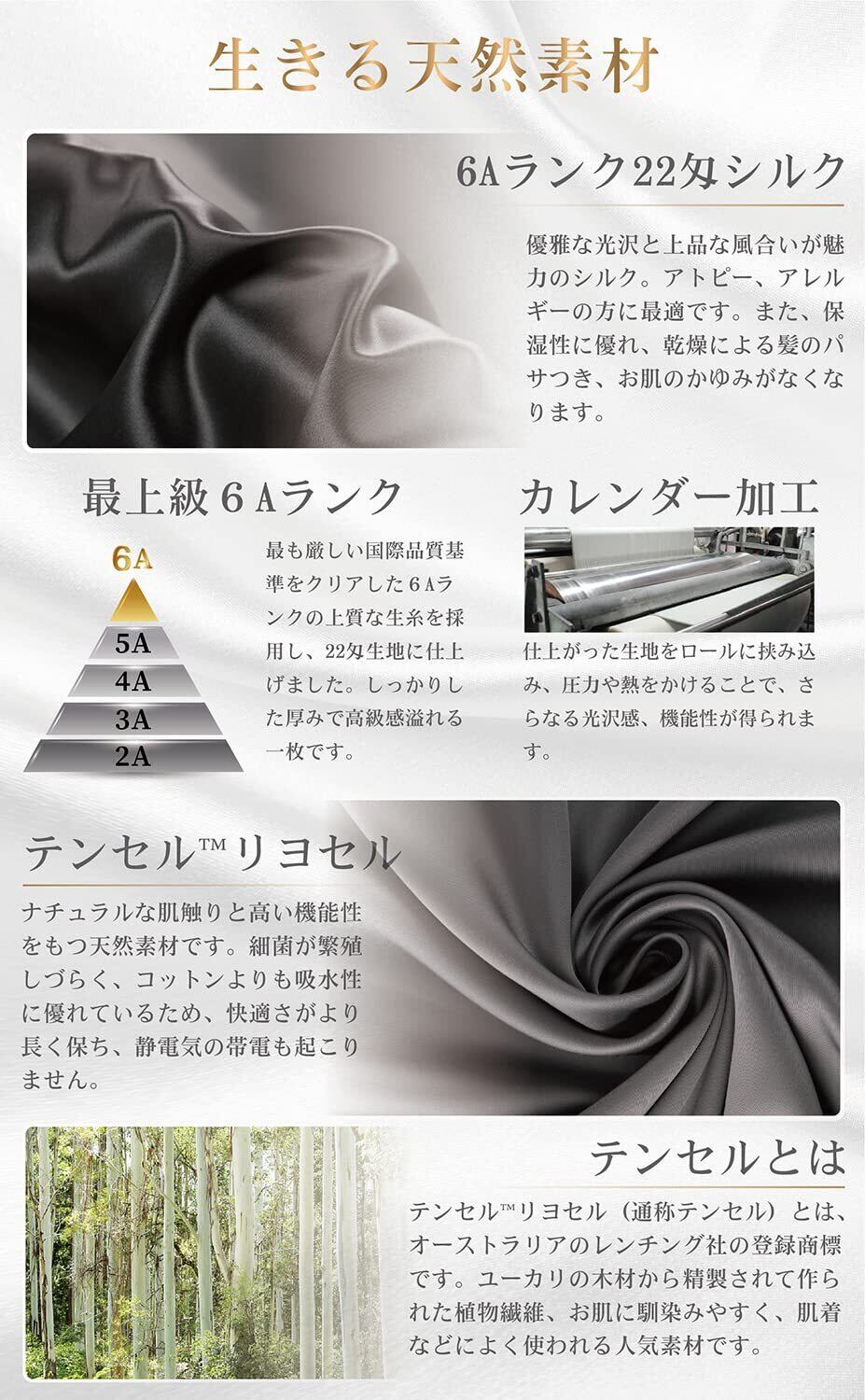 【天然繊維へのこだわり】古くから愛用されていたシルク素材、格調高雅な風合いと光沢が人々を魅了します。その中でもっとも希少な6Aクラス生糸を厳選しております。さらに、厚手の22匁生地を使用し、滑らかな肌触りとドレープ感をお楽しみいただけます。また、独自のカレンダー加工により、さらなる密度とつややかさをプラスします。シルク繊維は皮膚に最も近い成分でできているため、お肌と髪を守る最高の素材です。裏面のテンセル(リヨセル)生地は天然木材から作られた素材です。シルクと同じく肌に優しく上品な風合いで人気を博しています。肌に刺激を与えることがほとんどなく、お肌が弱い方にも安心してお使いいただけます。機能性が満点な二種類生地で絶妙なハーモニーがうまれ、触れるたび心も身体も癒してくれます。