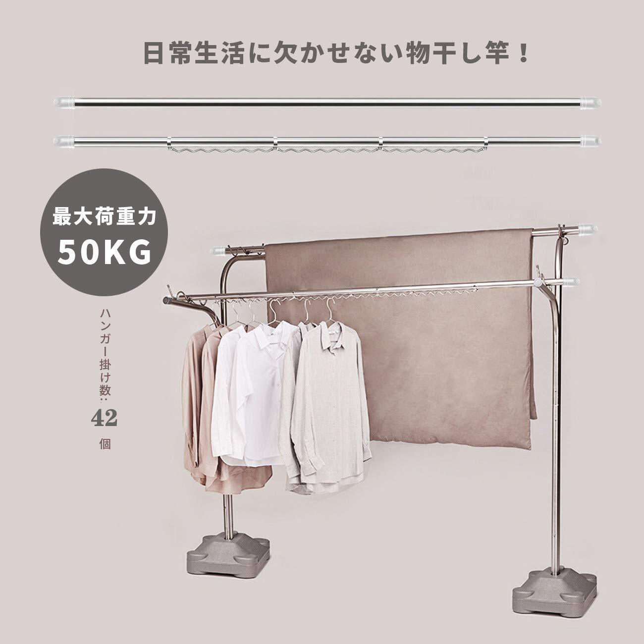 ステンレス物干し竿:ものほし竿本体はすべて頑丈な 304ステンレス製で、サビに強くて、日差しで変色することがなく、いつでも清潔にお使えいただけます。オールステンレスで、お手入れが簡単!タオルなどで乾拭きをすれば、綺麗に汚れが取れます。パイプの厚さは8mmで他社の3-5mmのより太くてもっと丈夫です。最大荷重力は50KG。