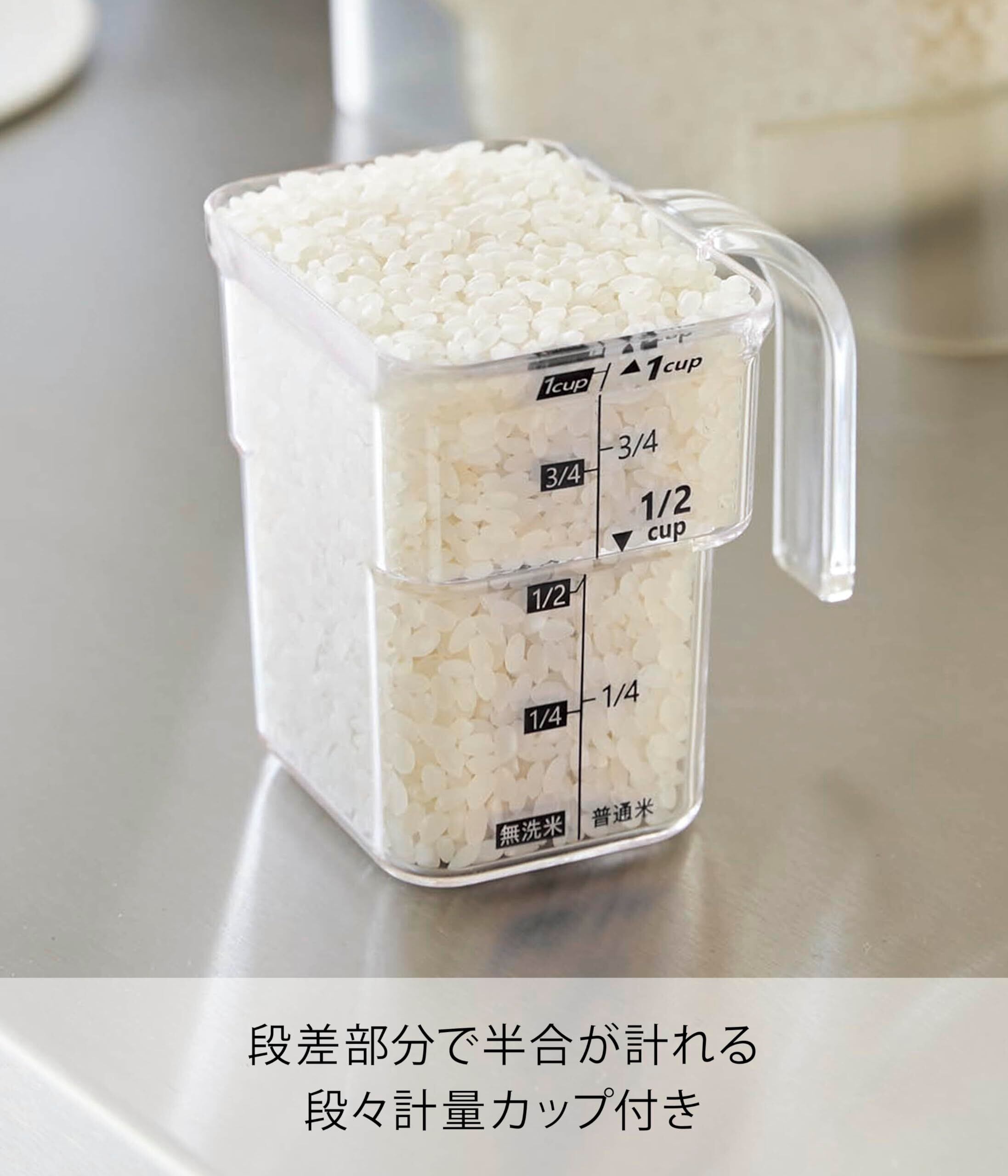 大きく開く透明蓋 片手で開閉 お米袋なら10㎏用をそのまま収納 洗えるから衛生的 段々米計量カップ付