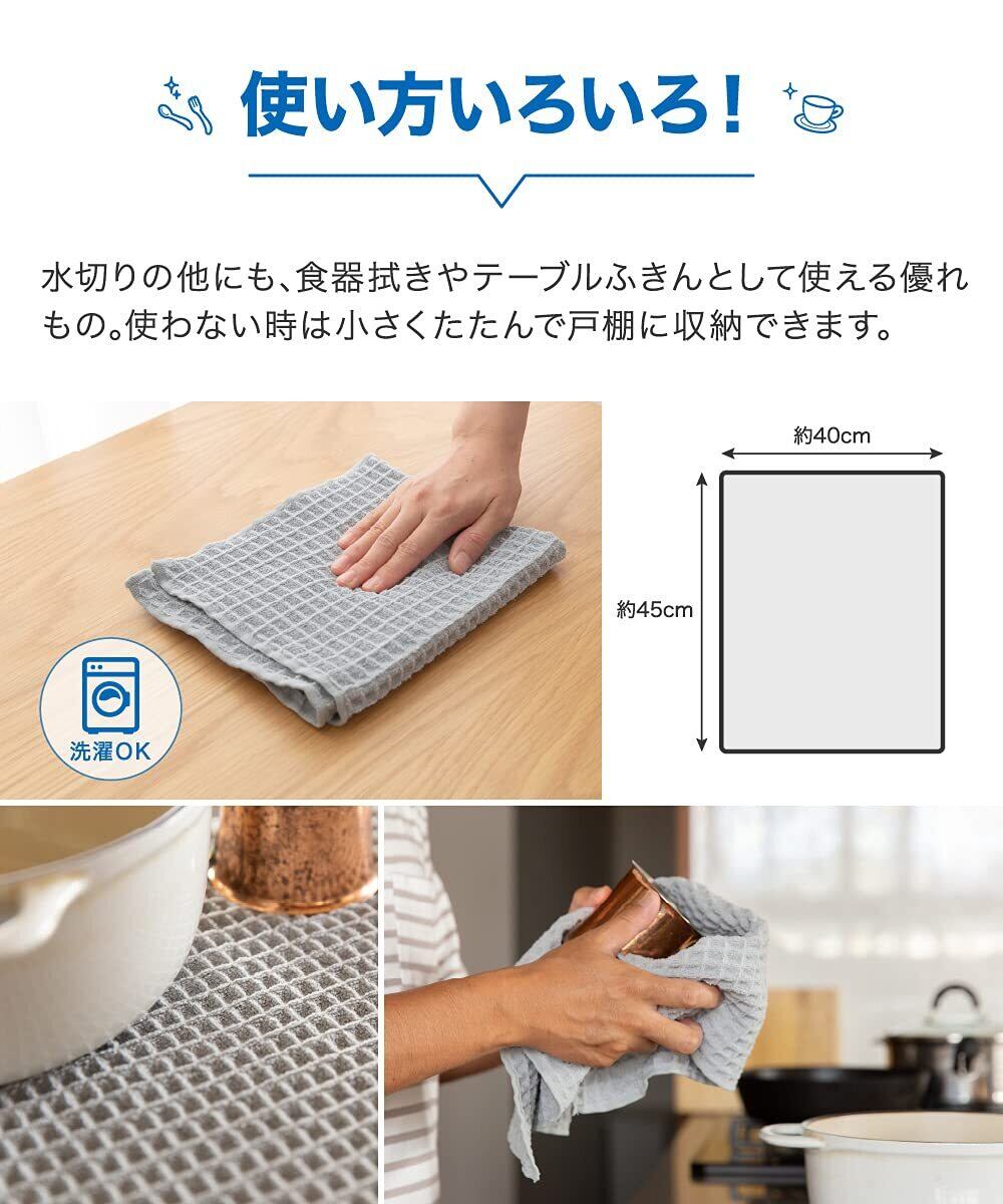 お皿などが滑りにくい凹凸ワッフル生地。ボリューミーで厚みがある生地が食器を保護。やわらか生地でふきんや食器拭きとしても使えます。