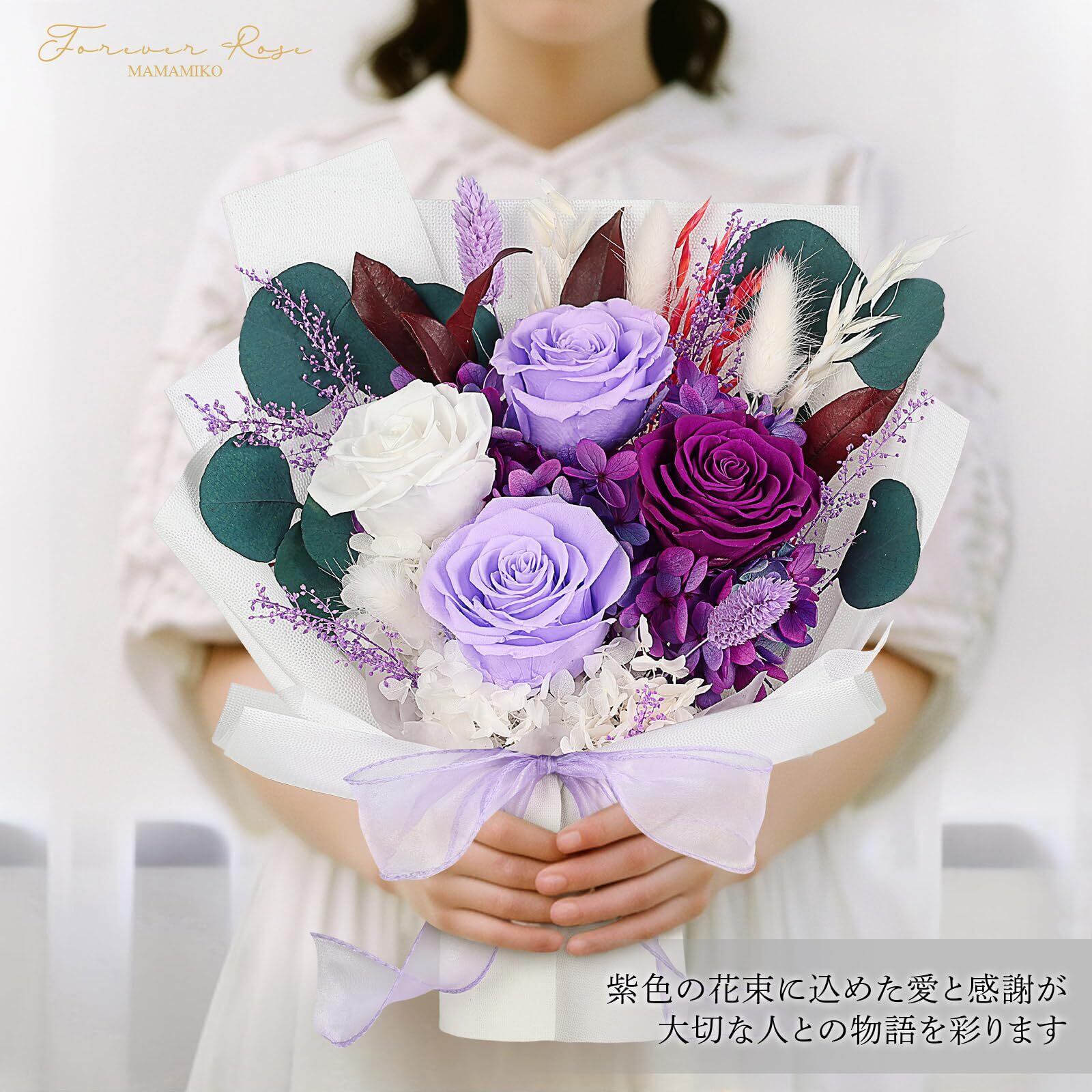 【手入れ不要、3年以上咲き続ける】この紫色の花束は、日本から発展したプリザーブドフラワー技術を用い、高品質な生花とバラを選んで丁寧に加工されています。生花のように儚く枯れることがなく、3年以上その美しさを保ちます。さらに、水やりやお手入れが不要で、そのまま飾って花の美しさを気軽に楽しむことができます。