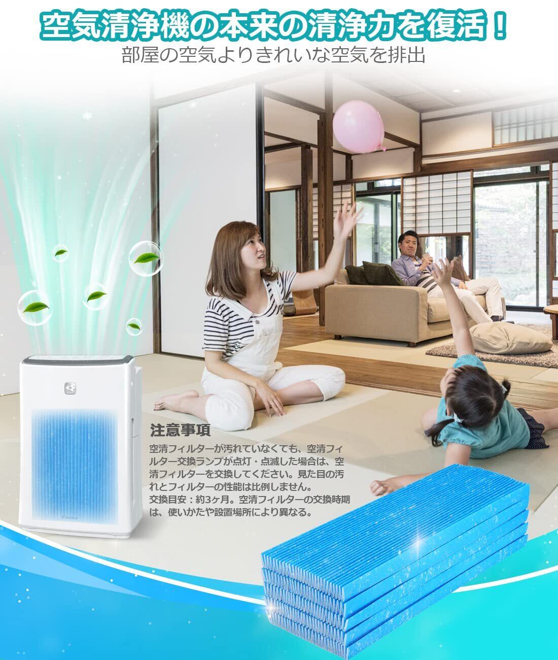 【交換の目安】約3-4ヶ月ごとにプリーツフィルターを交換してください。空清フィルターの交換時期は、使いかたや設置場所により異なる。※空清フィルターが汚れていなくても、空清フィルター交換ランプが点灯・点滅した場合は、空清フィルターを交換してください。見た目の汚れとフィルターの性能は比例しません。フィルターを交換した後、空清フィルター交換のリセットボタンを2秒間長押してください。