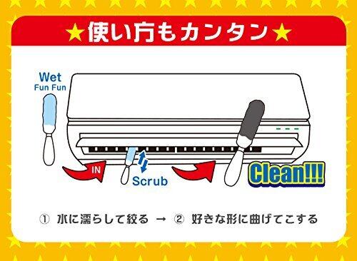 【ご注意】●必ず使用前にエアコンの電源を切り、コンセントを抜いてください。 ●コンセントを抜けない場合はブレーカーを落としてから使用してください。 ●本商品を水で濡らし、よく水を切ってからエアコン送風口に差し込み、何度かこすって送風口についた汚れを落としてください。 ●水が垂れない程度に水をよく切って使用してください。あまりに濡れている状態で使用するとエアコン本体の故障の原因になります。 ●用途以外の使用はしないでください。 ●使用時にムリな力をかけてこすると、風向きを変えるルーバーが外れたり、送風ファンが破損する可能性があります。強くこすらないでください。