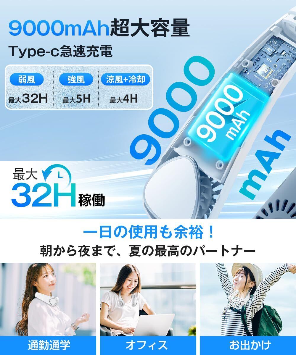 ❄️【3段階風量調節 × 9000mAh大容量】 3段階風量調節 が可能な USB扇風機 。シーンに応じて微風・中風・強風を切り替え、より快適に使用できます。 9000mAh の 充電式 バッテリー を搭載し、長時間連続使用が可能!アウトドアや花火大会、スポーツ観戦などでも活躍するだけでなく、日常的に使うにも最適な 首掛け扇風機 です。