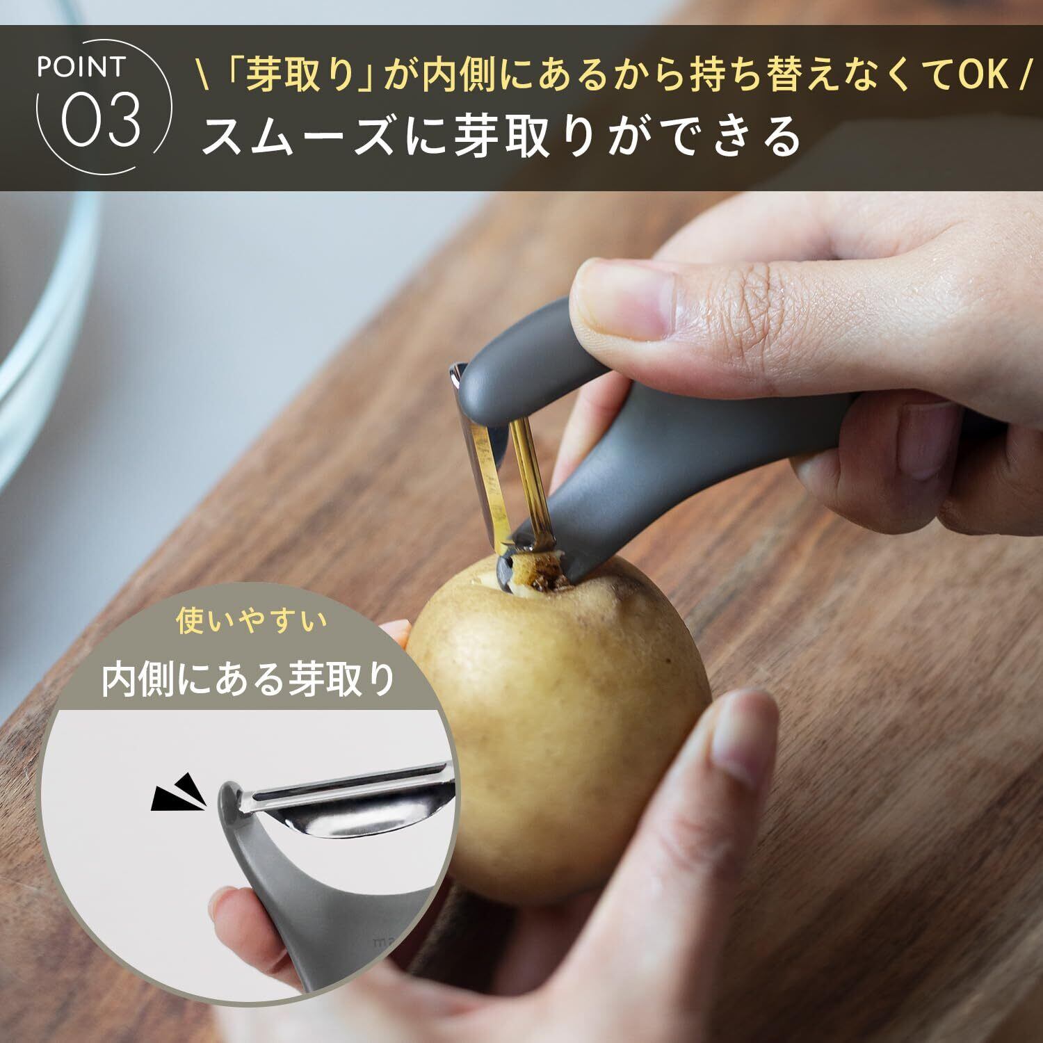 【持ち替えなくても作業ができる】「芽取り」が内側に付いているので、持ち替える必要がなく、スムーズに作業ができます。カレーやシチューなど、じゃがいもや人参など根菜が多い料理も活躍します。