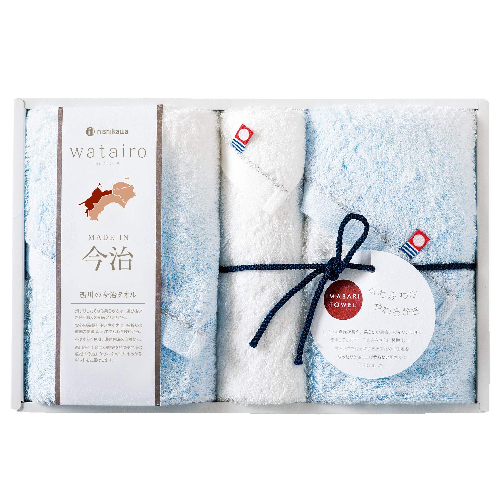 【特価商品】nishikawa【西川】 今治 タオルギフト フェイスタオル 2枚 ハンドタオル 1枚 わたいろ 綿100% ふわふわ 日本製 ギフトパッケージ入り ブルー TBF3497211B | lcsshop
