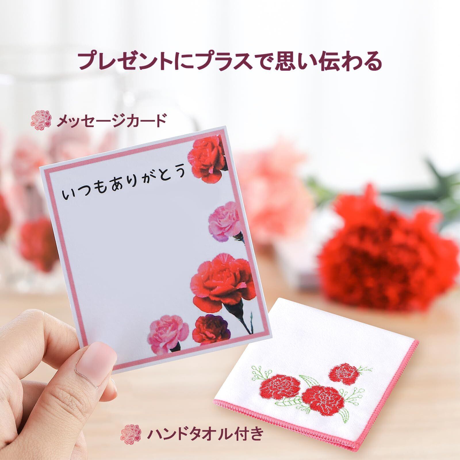 【滑らかな手触りのカーネーション刺しゅう入りハンドタオル付き】 ギフトセットとして、滑らかな手触りのハンドタオルを同梱しています。ワンポイントでカーネーションの刺しゅうが施され、母の日ギフトのセットとして特別感をアップさせます。