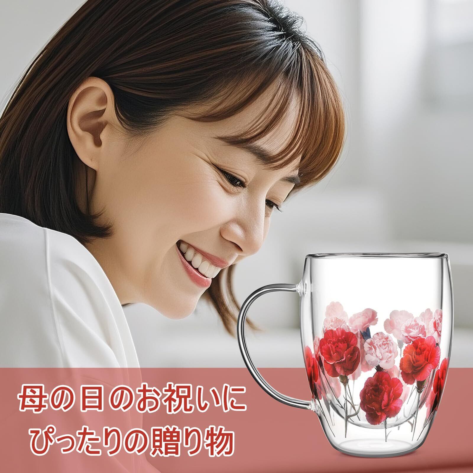 母親 誕生日プレゼント ダブルウォールグラス「カーネーション」ハンドタオル付き メッセージカード付き 桐箱入り 化粧箱入り お母さん 還暦祝い 古希祝い 退職祝い 耐熱グラス 取っ手付き 結露しにくい 保温保冷 350ml