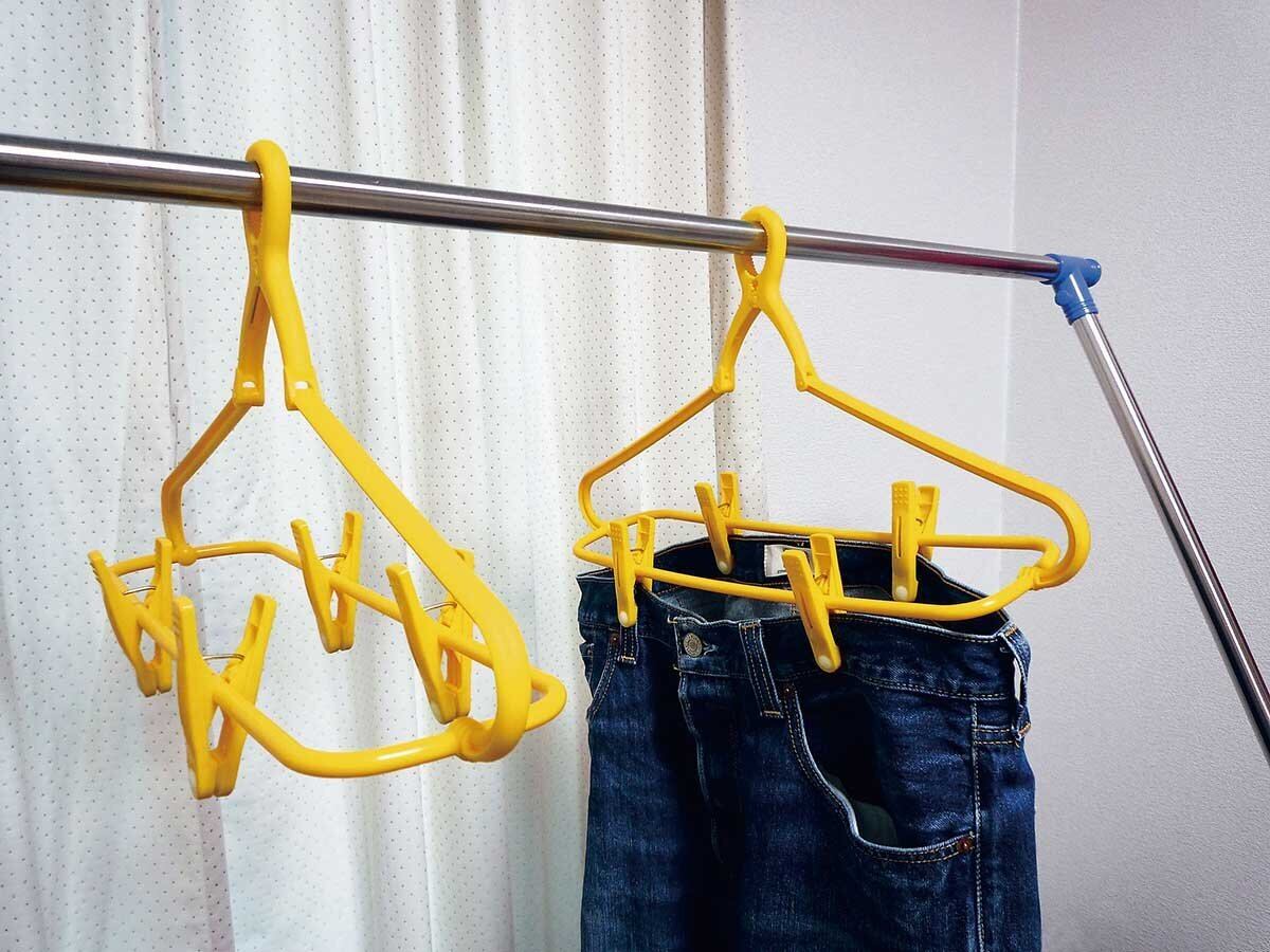 ●4つの強力バネクリップが重たいジーンズをしっかり挟んで形よく干せる
