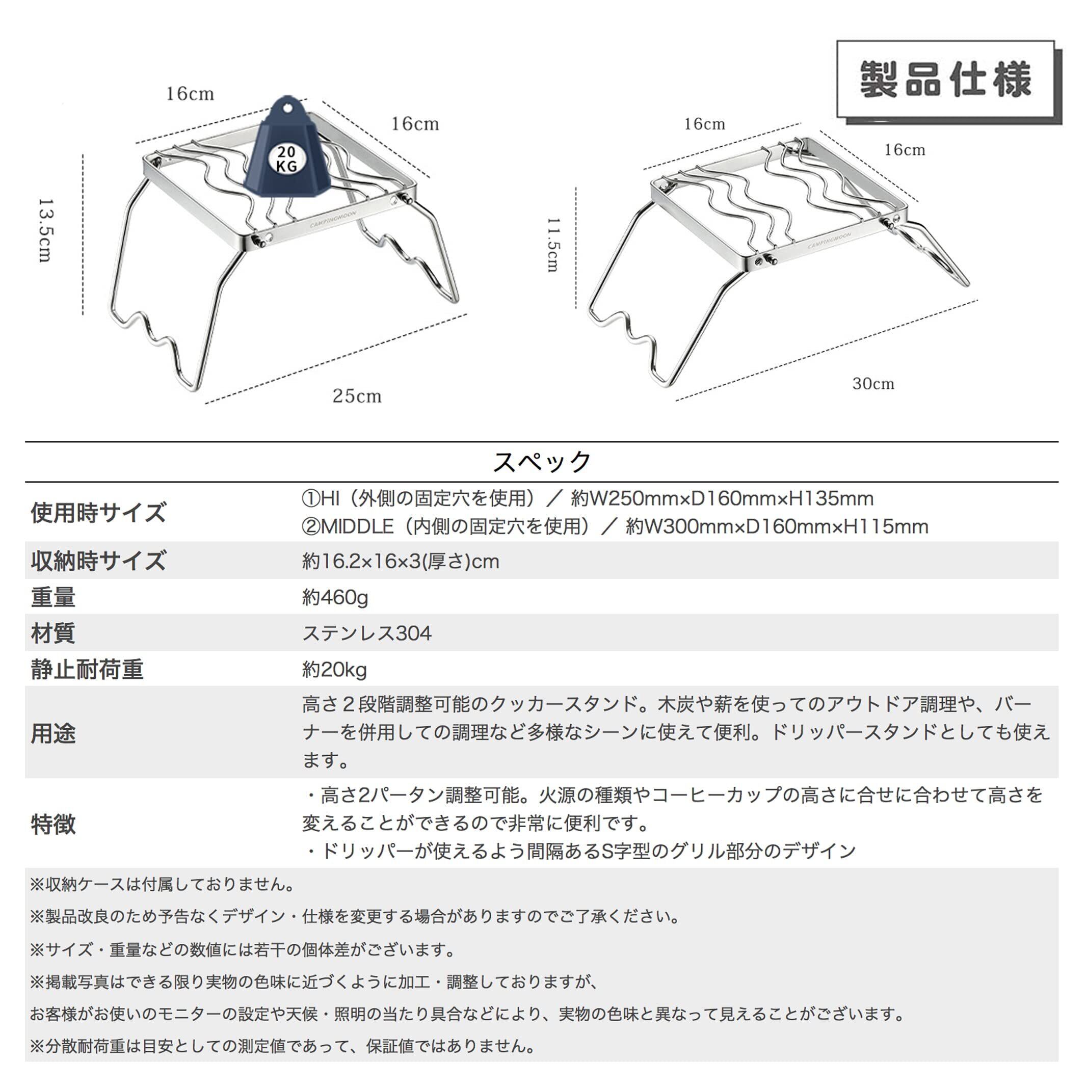 【用途】高さ2段階調整可能のグリル スタンド。木炭や薪を使ってのアウトドア調理や、バーナーを併用しての調理など多様なシーンに使えて便利。ドリッパースタンドとしても使えます。