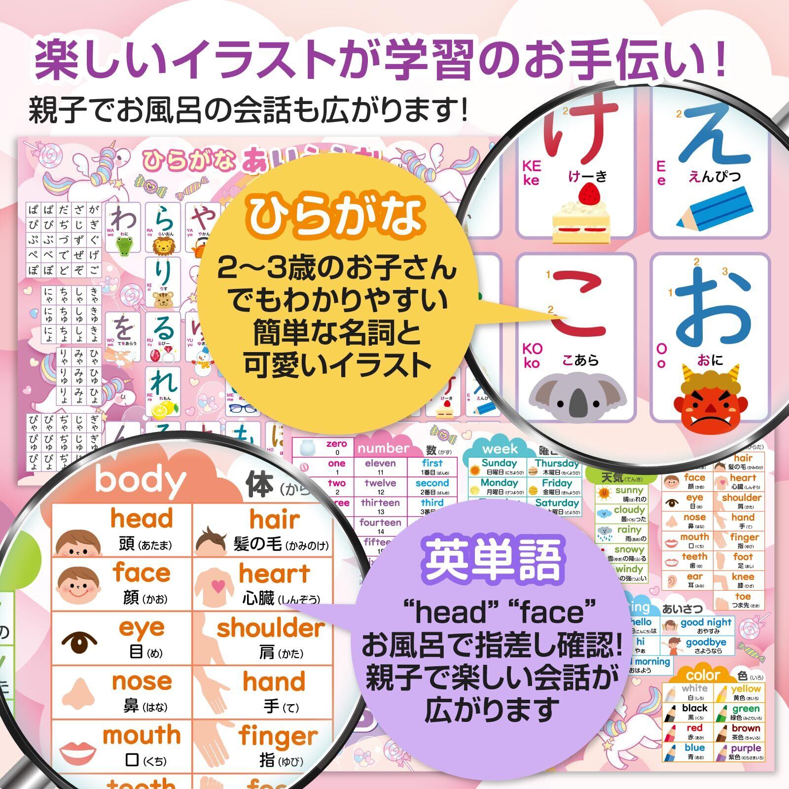 【耐久性と安全性】 ポスターは耐水性があり、お風呂場でも安心して使用できる素材で作られています。これにより、バスタイムを楽しく学びの時間に変えることができます。耐久性が高く、長期間使用しても劣化しにくいため、親子で安心して使用できます。