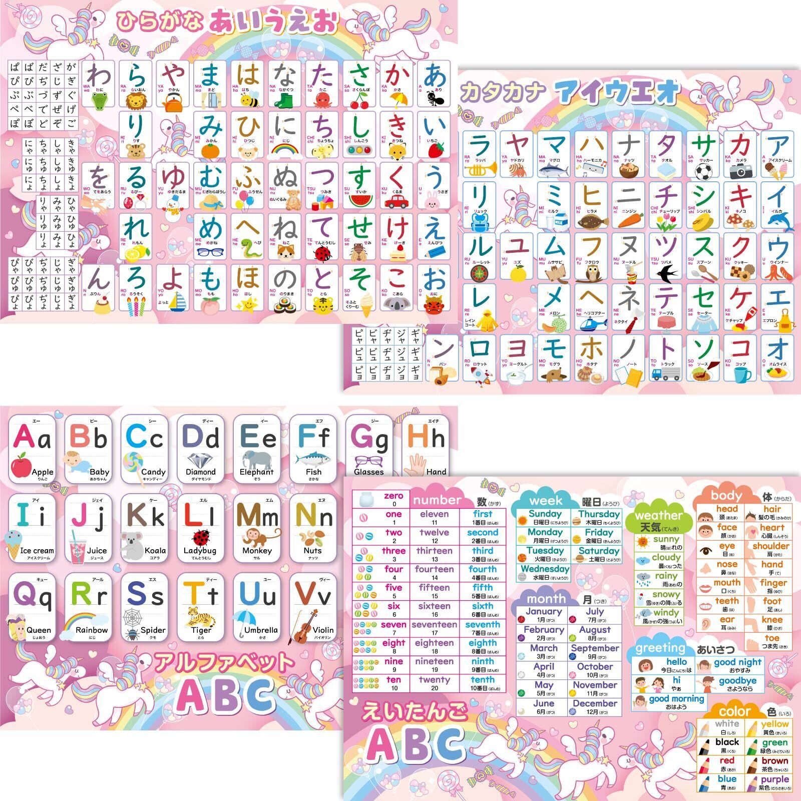 【多彩な学習内容の網羅】 4枚のポスターには、ひらがな、カタカナ、アルファベット、英単語(数字、曜日、天気、体の部分、挨拶、色)など、多岐にわたる学習内容が含まれています。子供たちは一つのセットで日本語と英語の基礎を幅広く学ぶことができます。