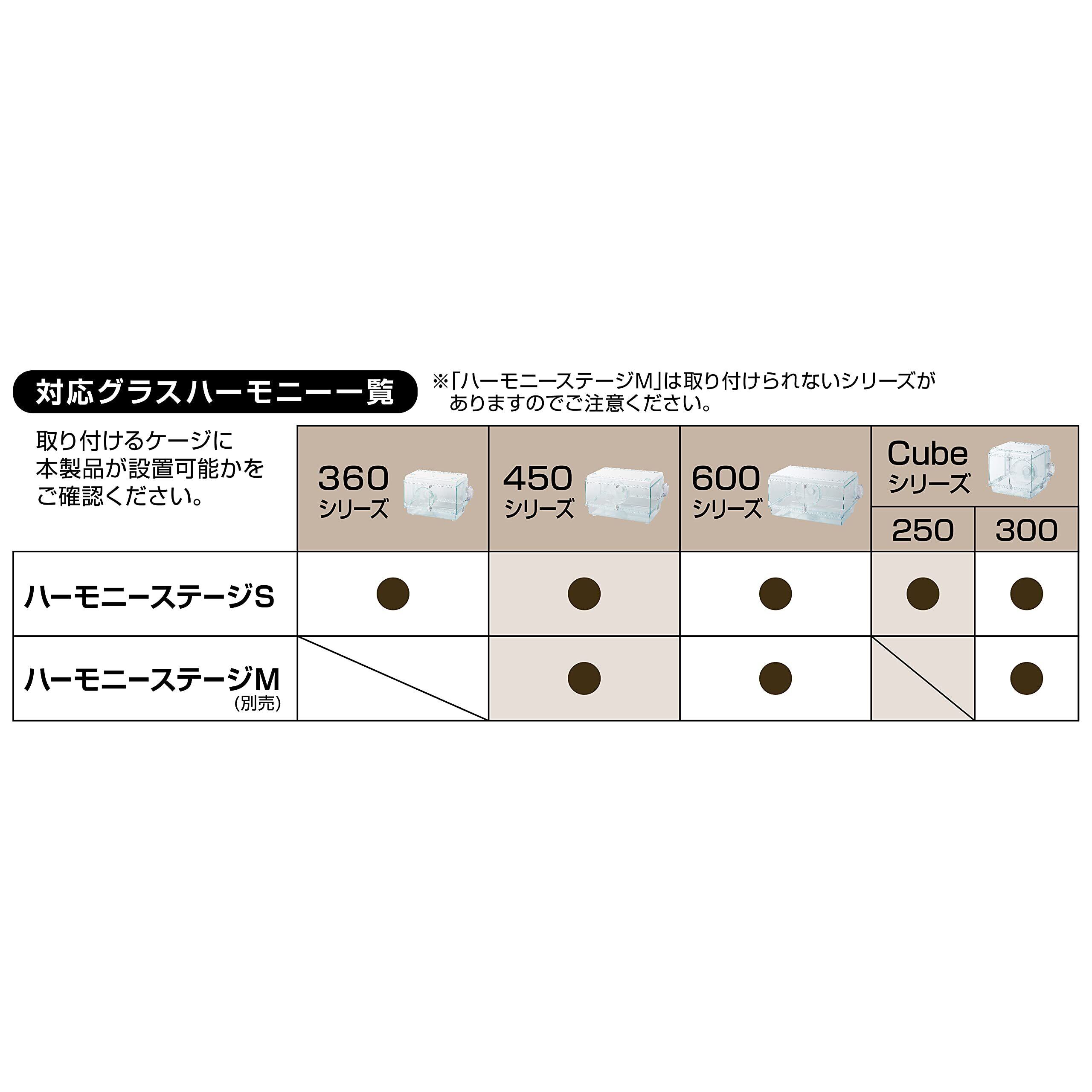 生活空間広がる「ハーモニーステージS」 グラスハーモニー専用ののぼっておりて運動できるステージ! ステージの上には「ハーモニーハウスS」(別売)が乗せられます。ステージの上に「ハーモニーハウスS」を乗せてロフト風に。 「ハーモニーハウスS」(別売)がピッタリ乗せられる、ハウスストッパー付き。 ステージは丸洗いできるのでいつも清潔! リバーシブルでグラスハーモニーの左右どちらのボトル取付け穴に使用可能。 <対応グラスハーモニー>グラスハーモニー360シリーズ、450シリーズ、600シリーズ、CUBEシリーズ(250,300) <ご使用方法>●本製品をケージの中に入れ、付属の部品で固定し取り付けてください。 <製品サイズ>約幅15.5×奥行14.5×高さ5.0cm(ネジ部、スロープ除く) <セット内容>ステージ、スロープ、ゲタ、ネジ