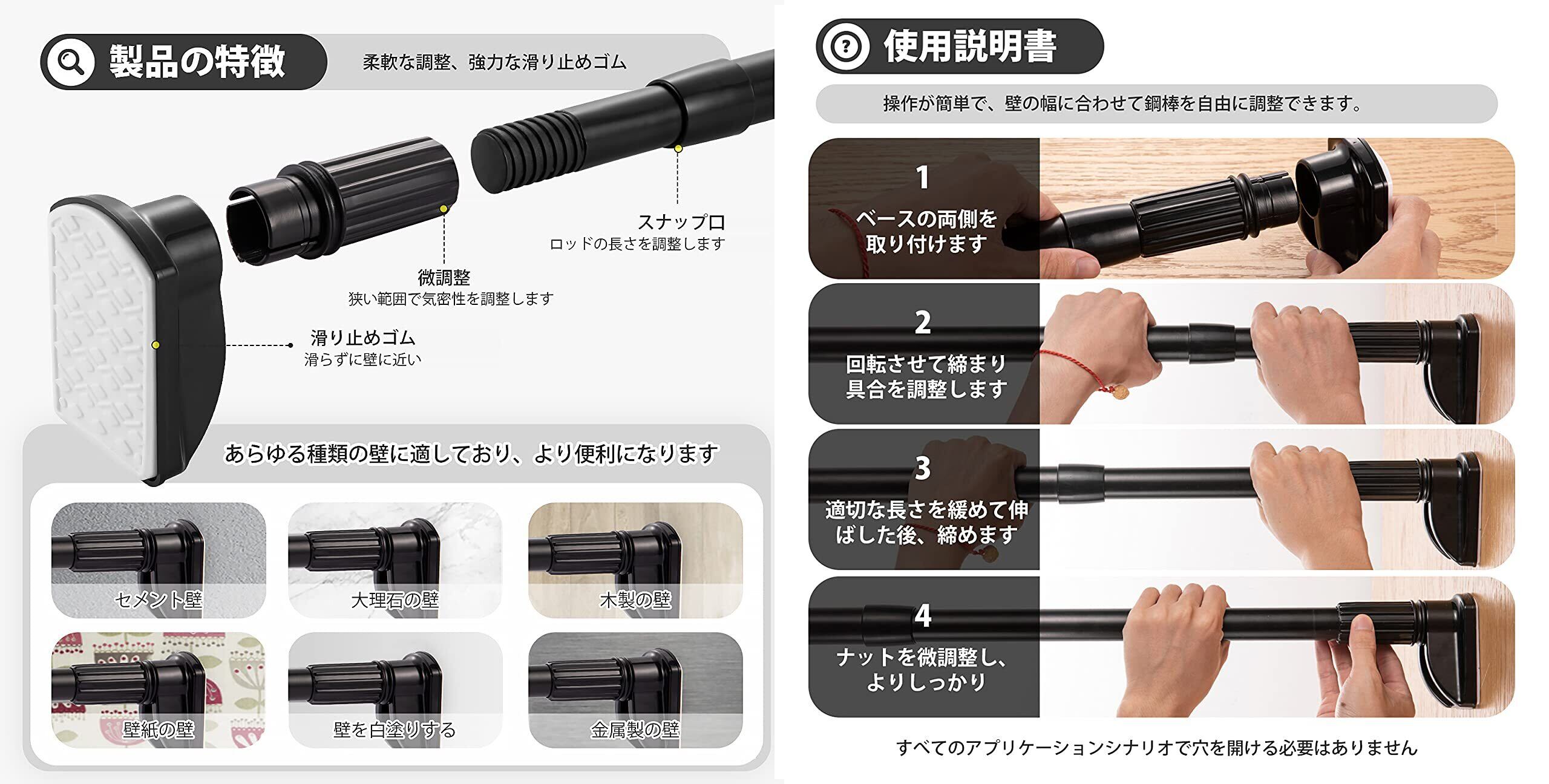 【簡単な取り付け】圧着板の壁に接する部分はゴムっぽい素材になっており、壁にぴったりします, 両サイドにダイヤモンド格子の凸凹がデザインされた摩擦力の高いシリコーンヘッドが採用され、2段式伸縮パイプを任意の長さに調節し回してロック、片側の回転式グリップを回すことで突っ張り固定できる仕様です。 くぎ ネジ パンチ等の工具を使わず、微調整ナットだけで簡単に取り付けられます。壁に穴がある心配もなく、壁に痕跡も残さないので、つっぱり棒を安心に取り付けて、