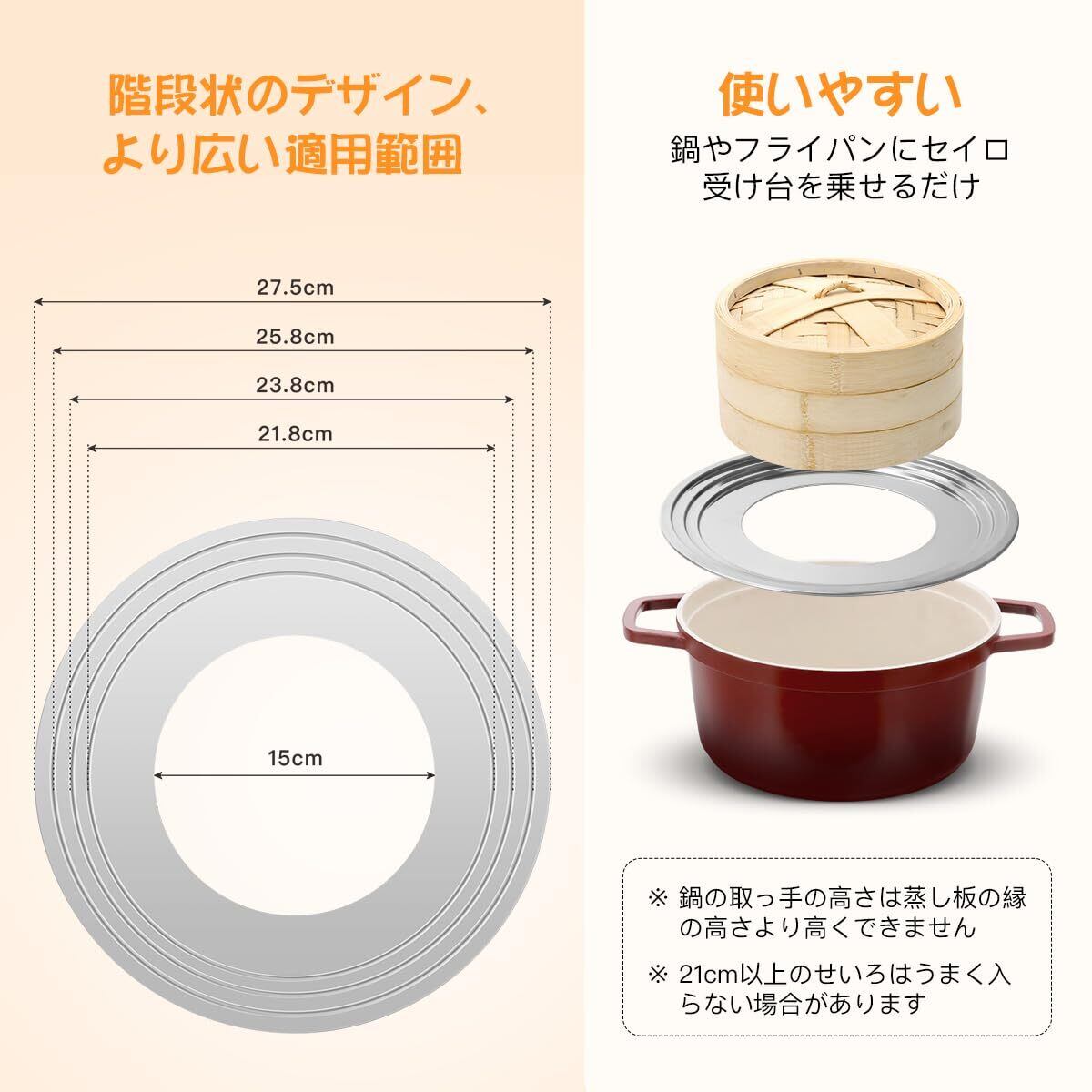 【新着商品】Aieve せいろ 受け台 蒸し板 せいろ 蒸し器15cm大内径 ステンレス18cm 21cm 24cm 蒸籠対応 3段階段式 20-24-27cm鍋 フライパン対応 蒸し料理 蒸籠用受け台 | lcsshop