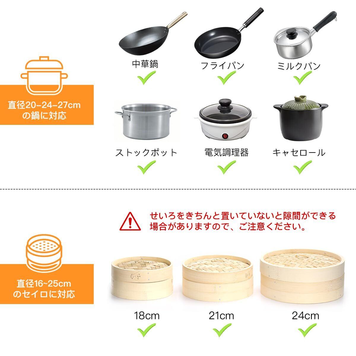【3段階段】せいろ 受け台は階段状のデザインで、直径20-24-27cmの鍋に対応しており、適用範囲が広がります。ストックポット、中華鍋、フライパン、ミルクパン、電気調理器、キャセロールなどさまざまなタイプの鍋に適応します。(※蒸し板の表面には青い保護フィルムが貼ってありますので、ご使用前に端から剥がしてください。)