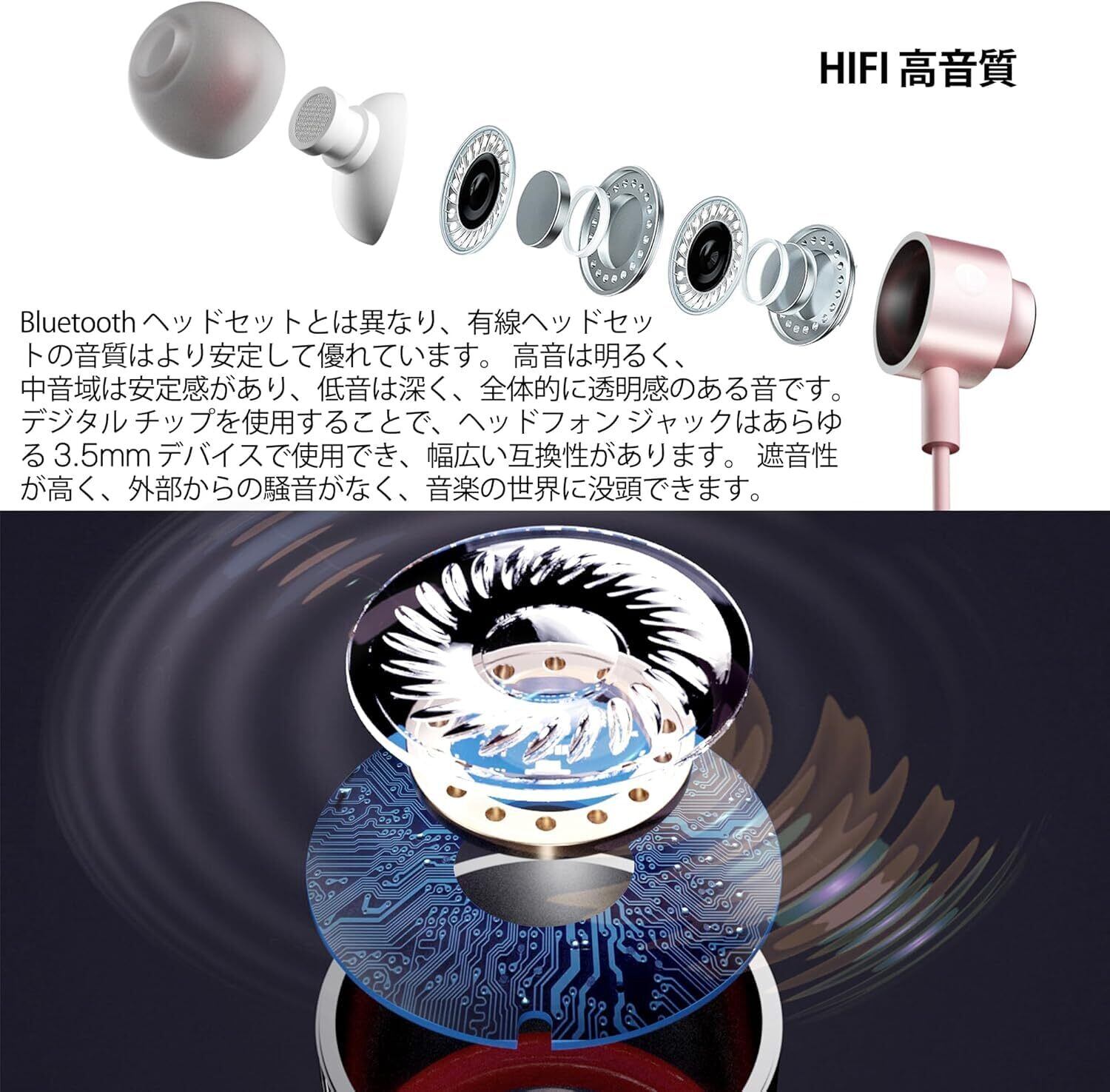 「快適さと遮音性を備えた高音質イヤホン」遮音性と快適性を備えたイヤホン。イヤホン 有線 付属の耳栓には大小2つのサイズがあり、耳の大きさに合わせて選ぶことができます。耳栓は柔らかいシリコン素材でできており、長時間使用しても違和感がありません。耳にフィットしやすく、脱落しにくい設計で、高い気密性と遮音性を確保します。HiFi超高音質で、音楽を存分に楽しむことができます。