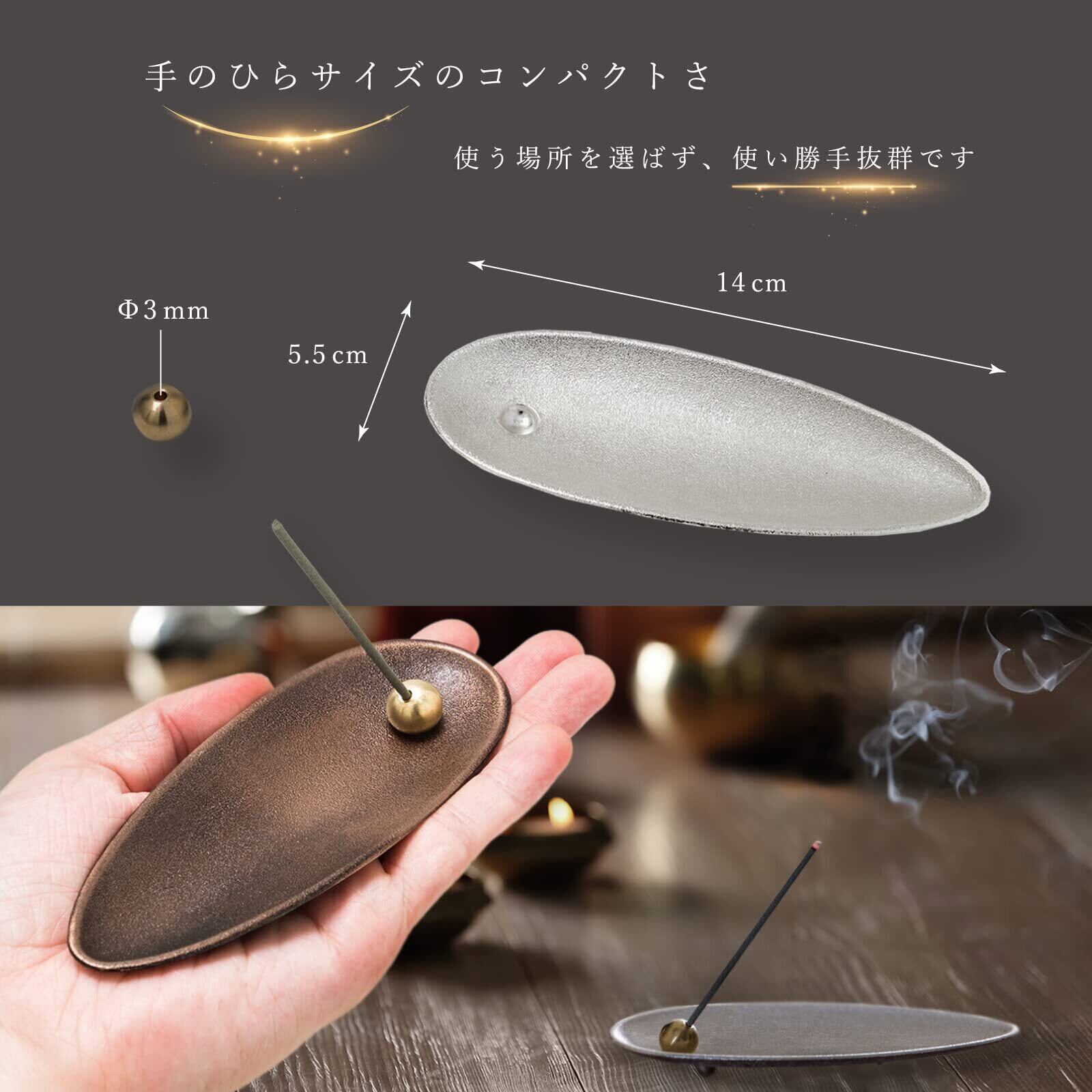 【機能性】香皿の直径1㎝の溝に球が収まります。球には直径2mmと3mmの穴がありそこにスティックタイプのお香を差し込みお好きな角度でお香を楽しみます。【注意】香皿の全長が14㎝とコンパクトなため11㎝以上のお香は横向きですとはみ出てしまうため推奨しておりません。また、お香が長すぎると球がその重さに耐えられなくなり危険ですので長いお香を利用される場合は11㎝以下にしてお使いください。材質は合金製のため万が一落下しても割れづらくなっております。底面の支柱がしっかりと本体を支え安定感がございます。