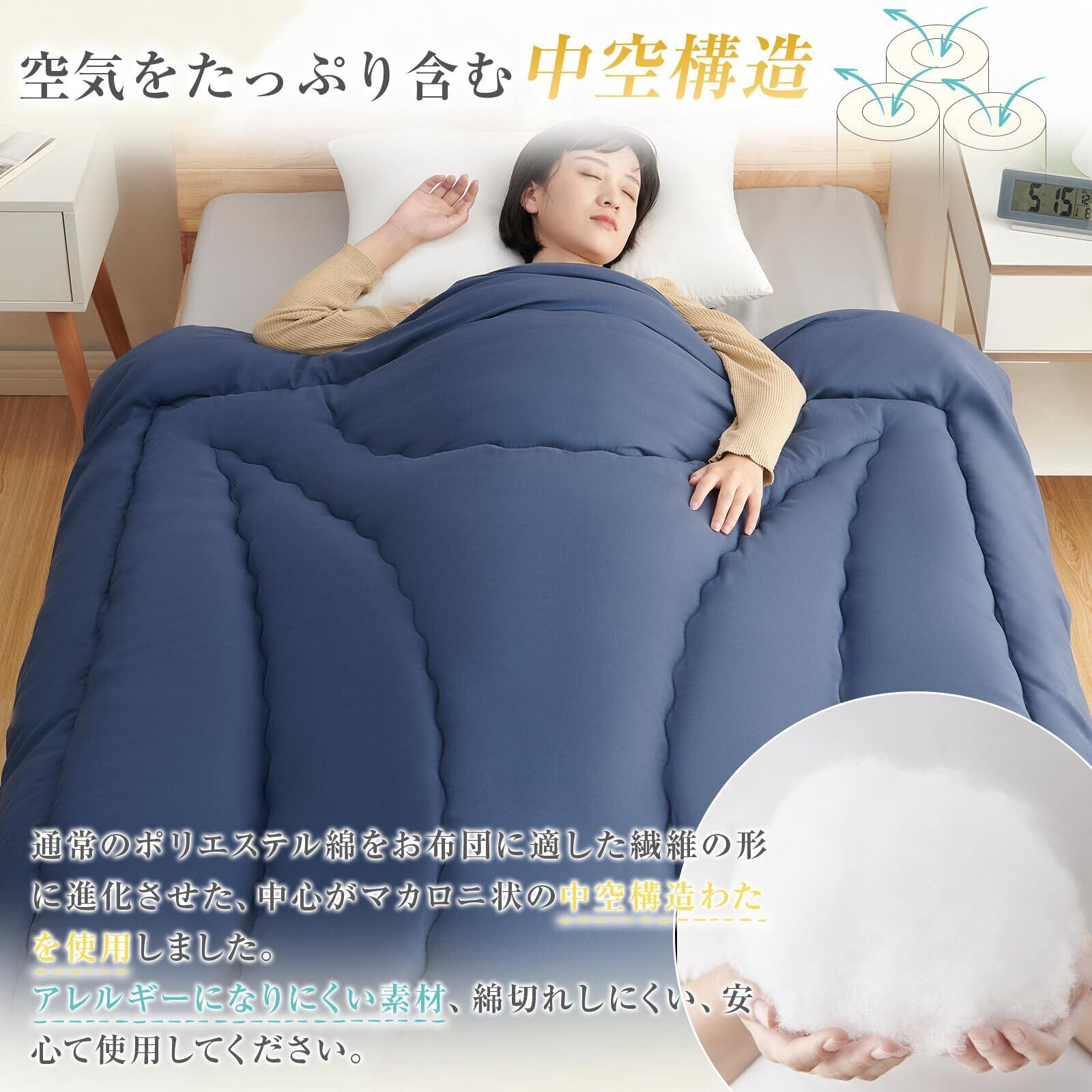 【ピーチスキン加工、やわらかくしっとり触感】肌に優しいピーチスキンの触り心地でしっとり気持ちよく、ムレにくく快適です。ほこりが出にくい、綿切れしにくい、中空ポリエステル綿を使用。ズレ防止ループ付き端の8ヶ所にズレ防止用ループが付いているので、お布団がズレる心配もありません。