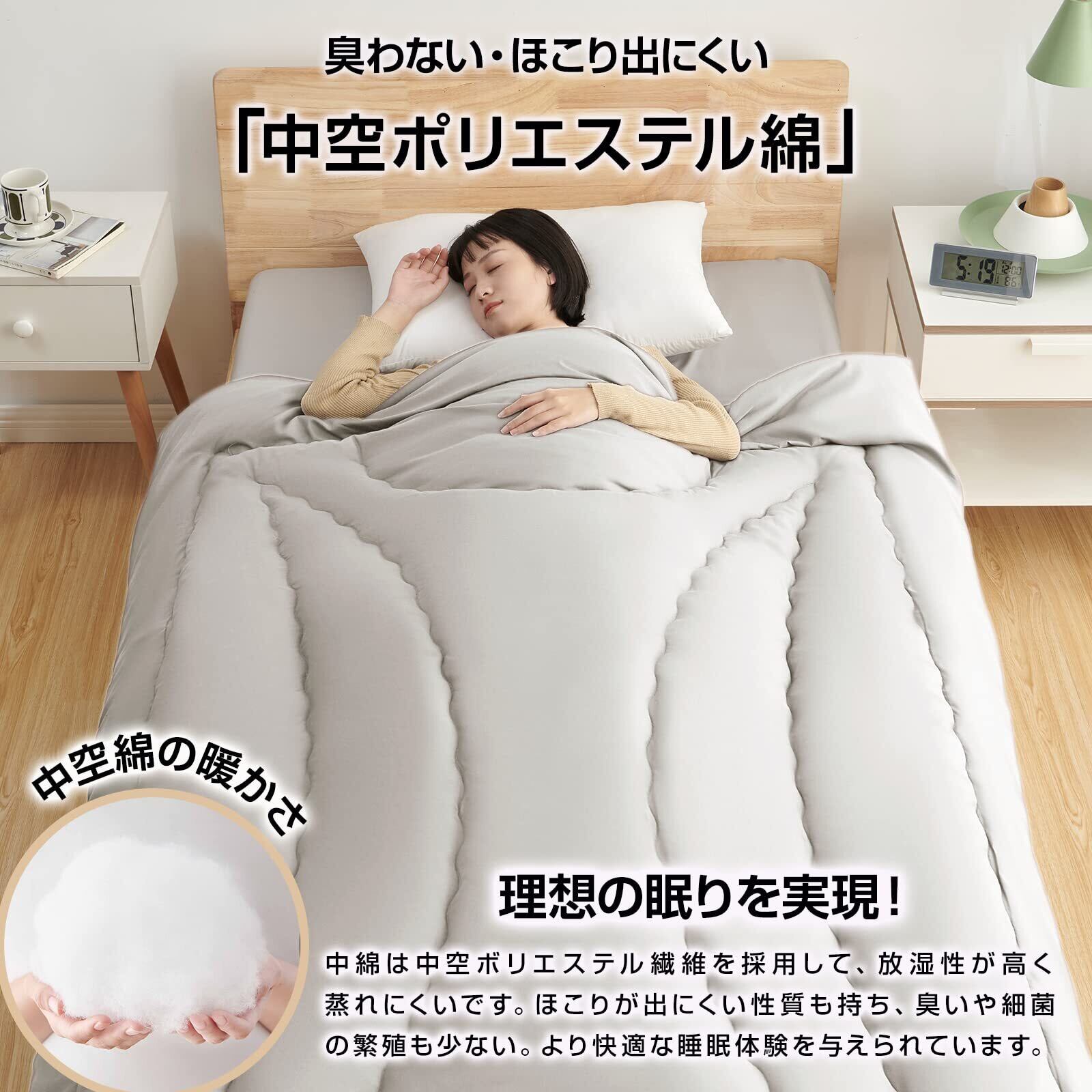 【ピーチスキン加工、やわらかくしっとり触感】肌に優しいピーチスキンの触り心地でしっとり気持ちよく、ムレにくく快適です。ほこりが出にくい、綿切れしにくい、中空ポリエステル綿を使用。ズレ防止ループ付き端の8ヶ所にズレ防止用ループが付いているので、お布団がズレる心配もありません。