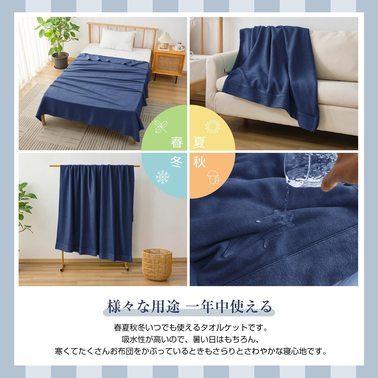 【オールシーズン・様々な用途】肌掛けのコットン素材なので、一年中お使いいただけます。汗ばむ季節は吸水性があるのでサラッと快適で、冷房の効いた部屋での毛布としてもお使いいただけます。肌寒い季節はパイルが程よく空気を含んであたたかく、毛布の代わりに布団のインナーとしても使えます。また、シーツとしても適しています。 ホームだけでなく、温泉・旅行・お花見などいろいろなシーンで大活躍します。自分が使うだけではなく、同僚、上司、お客様へのお礼、友達祝い、親孝行、祝日のギフトにも適しています。