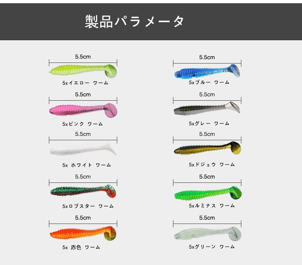 セット内容:ジグヘッド50個(1gx10、1.8gx10、2.5gx10、3.5gx10、5gx10)、ワーム50個、長さ5.5cm、10色、餌箱x1。