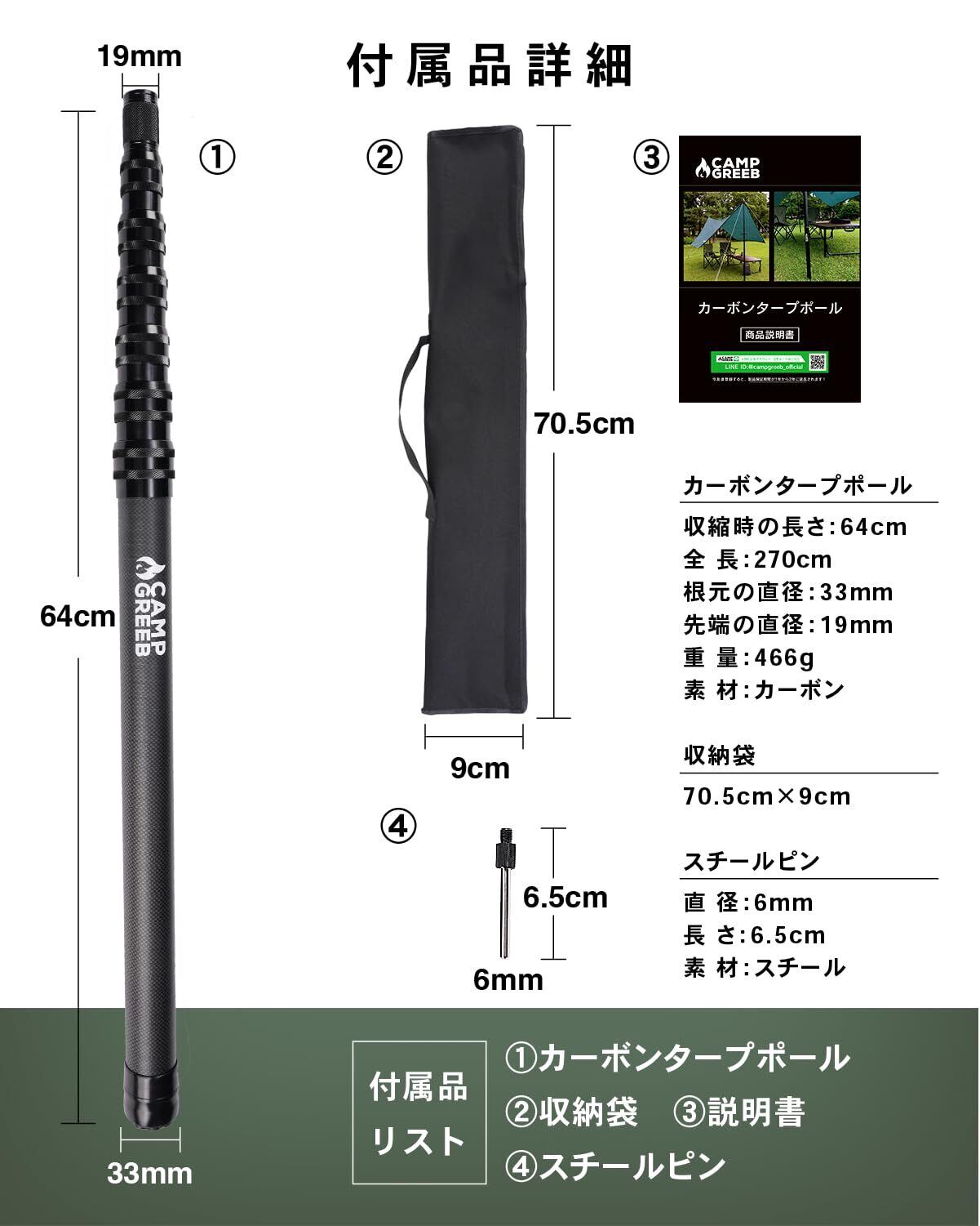 キャンプグリーブ タープポール カーボン製 テントポール 伸縮ポール 【日本人キャンパー監修説明書付】 (無段階調節)