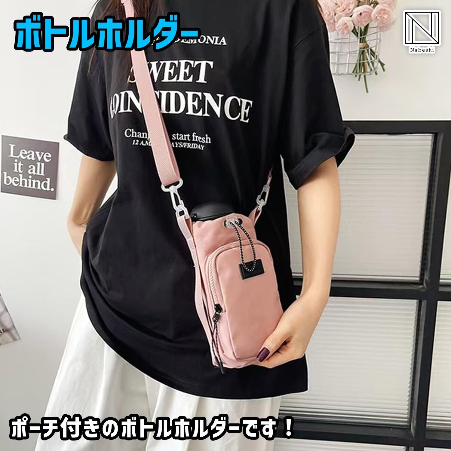 NABESHI ボトルホルダー 水筒ホルダー ペットボトルホルダー スマホポーチ 子供 肩掛け 防水 保冷 水筒 (ピンク)