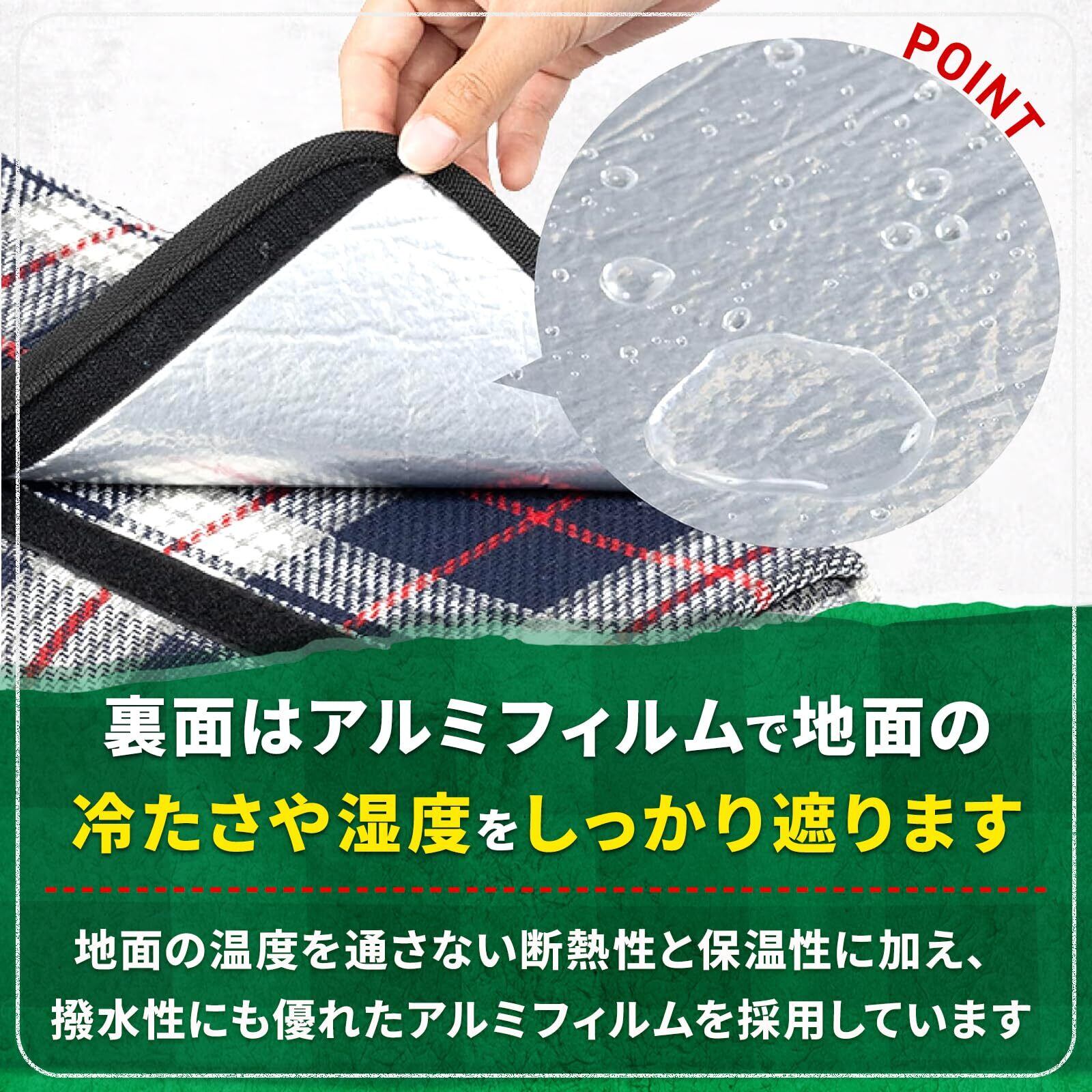 裏面はアルミフィルムで地面の冷たさや湿度をしっかり遮る。地面の温度を通さない断熱性と保温性に加え、撥水性にも優れている。
