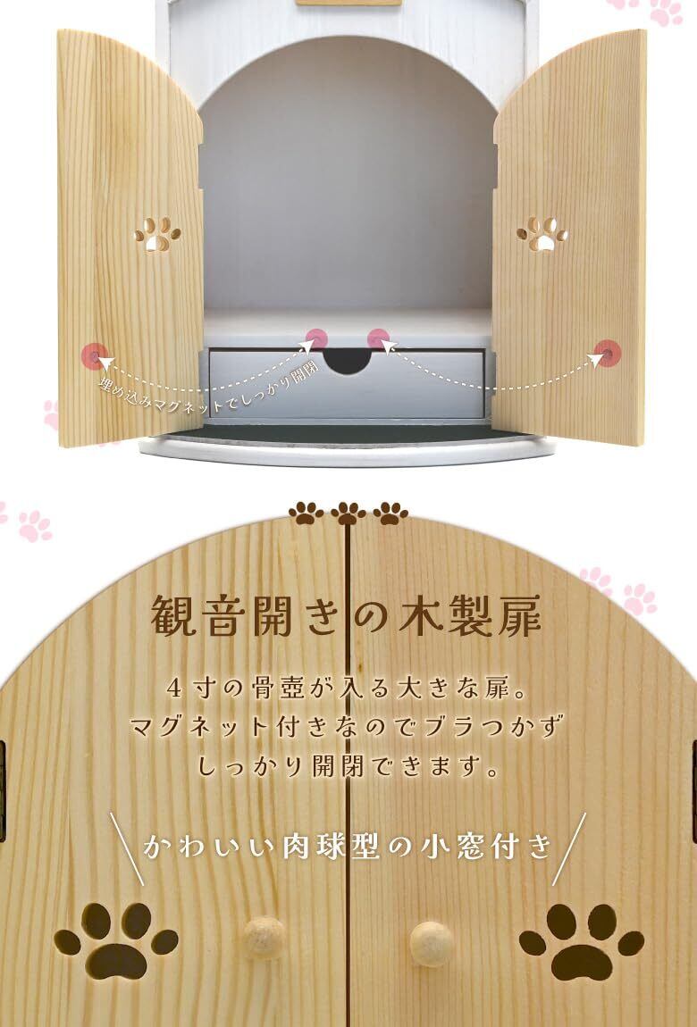 マグネットでしっかり開開 観音開きの木製扉 4寸の骨壺が入る大きな扉。 マグネット付きなのでブラつかず しっかり開閉できます。 窓付き/ かわいい肉球型の小窓付き