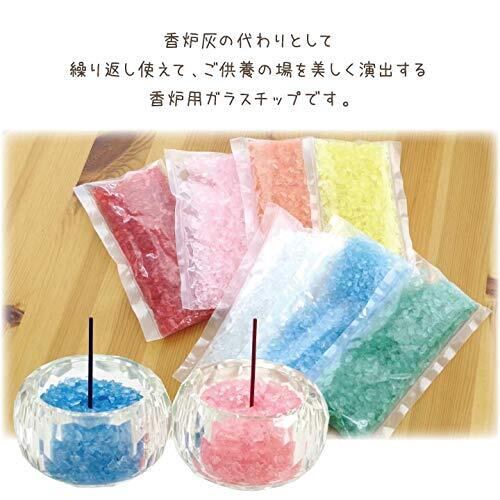 ※こちらの商品は、色の付いたガラスをチップ状に加工しているものです。強い力を加えると砕ける場合がありますのでご注意ください。 ※お線香の熱に触れた部分が少々変色する場合がございますがご了承ください。
